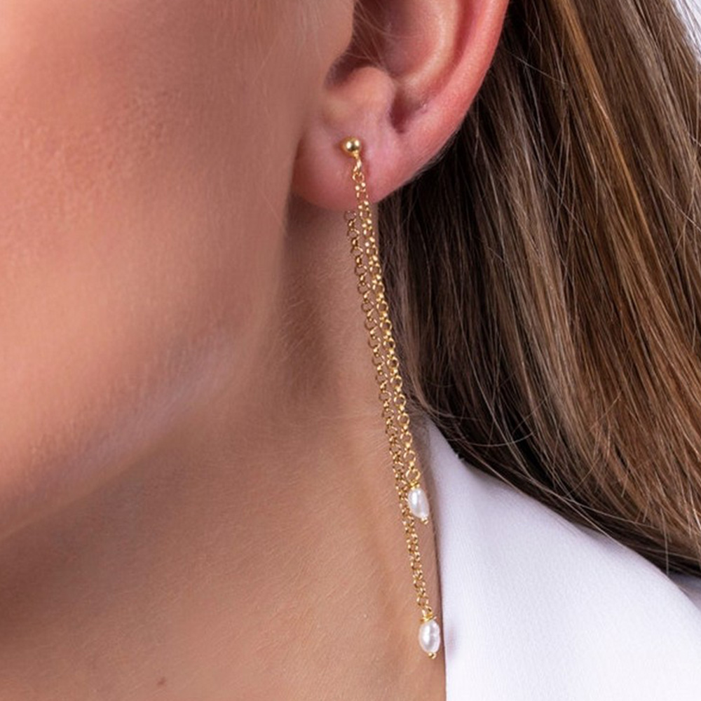 - Delicate double gold chains featuring natural freshwater pearl drops