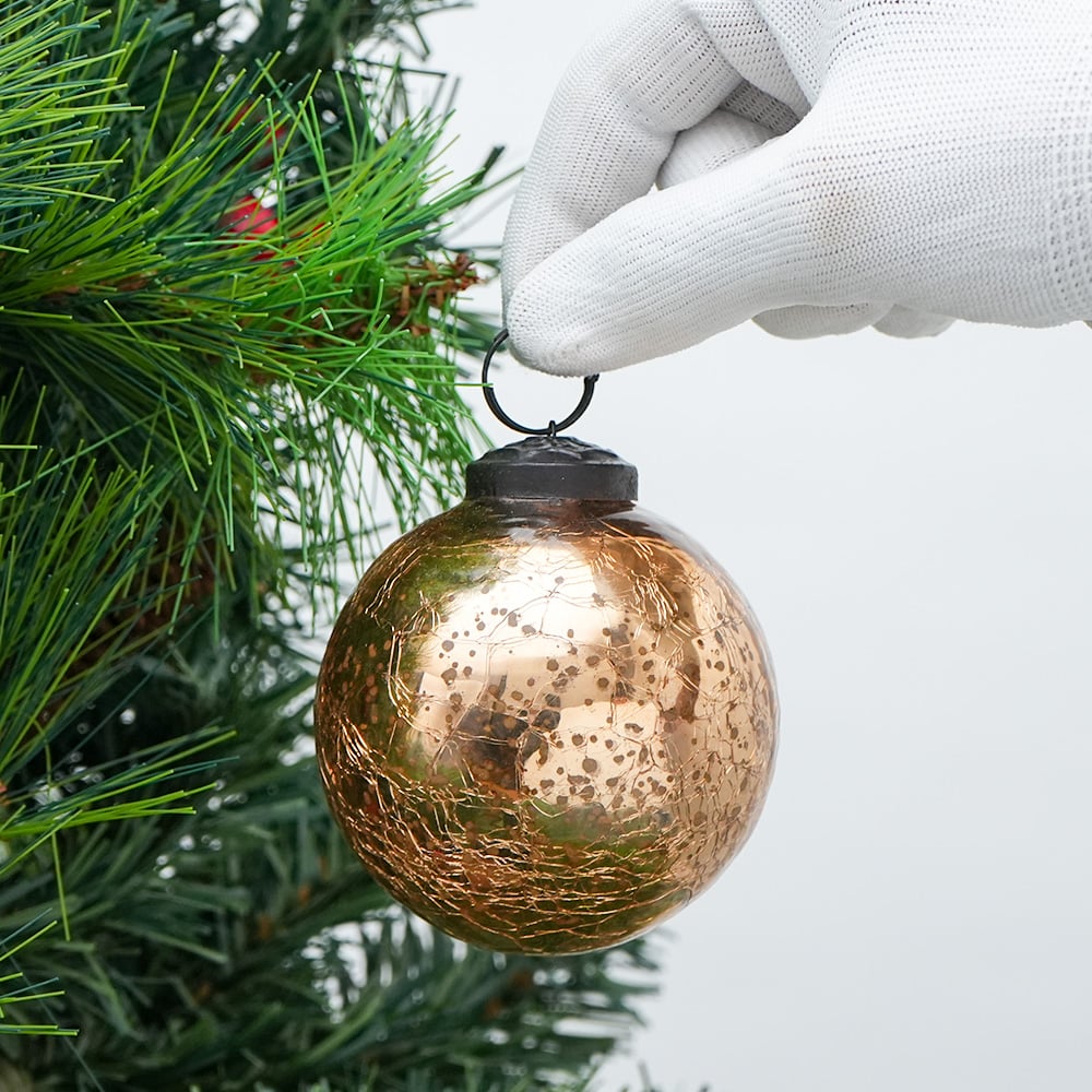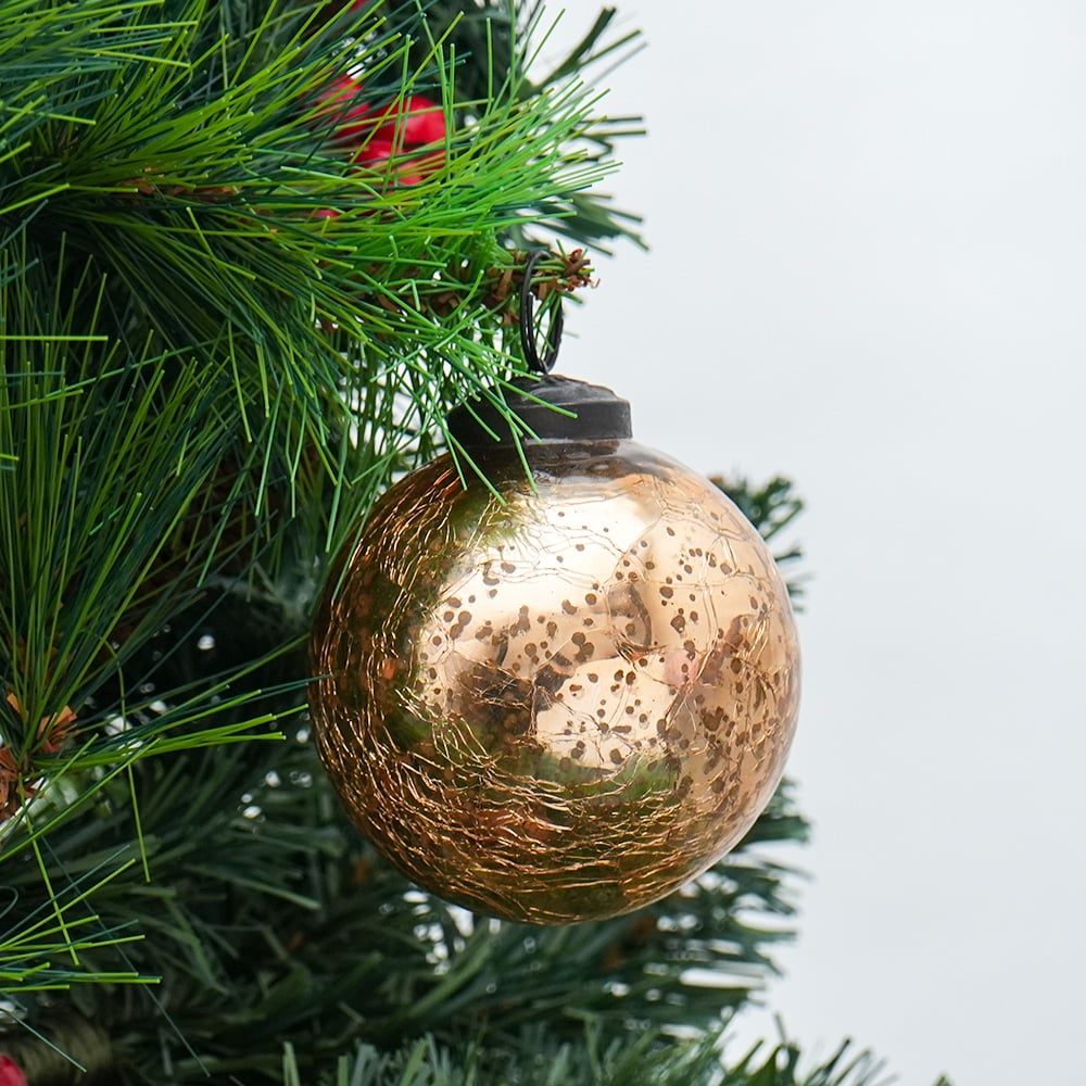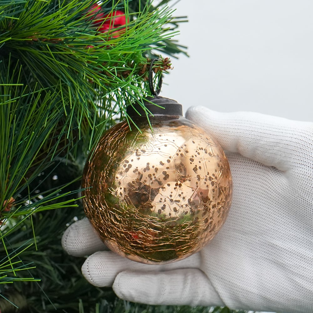 Gold Crackle Vintage Style Mercury Glass Hanging Ornament. Crafted from high-quality glass with a smooth glossy finish, this decorative bauble adds a classic and festive touch to Christmas trees, wreaths, and holiday displays.