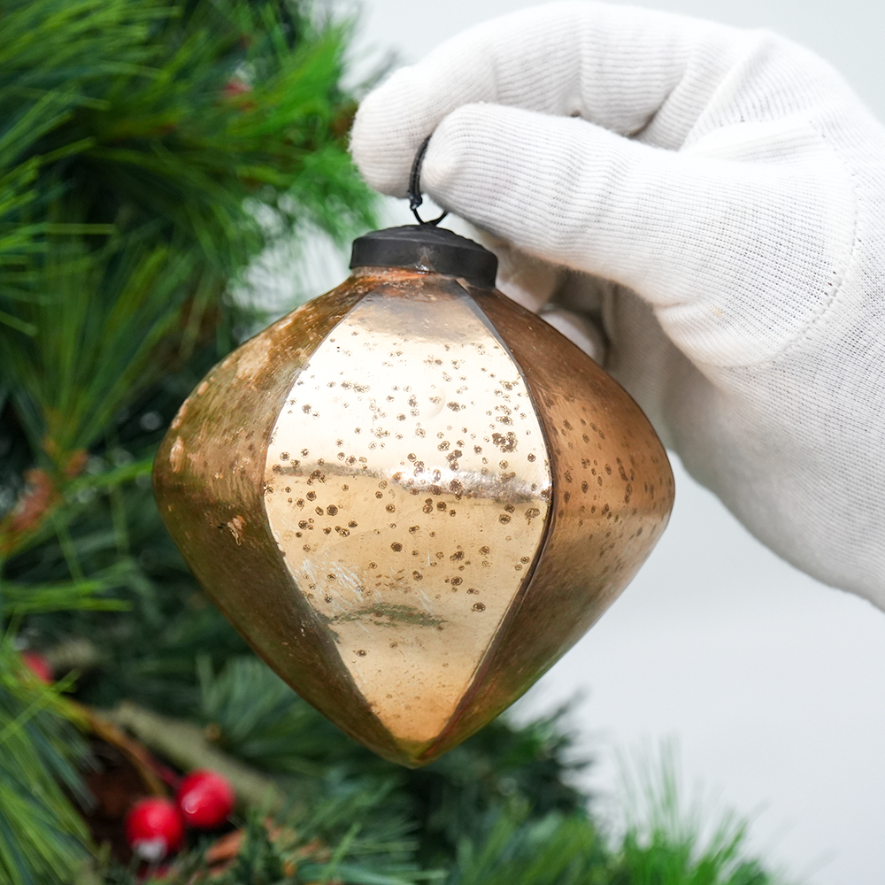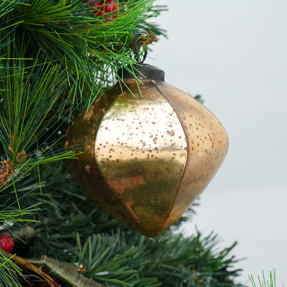 Gold Decorative Mercury Glass Diamond Shape Hanging Ornament . Crafted from high-quality glass with a smooth glossy finish, this decorative bauble adds a classic and festive touch to Christmas trees, wreaths, and holiday displays.