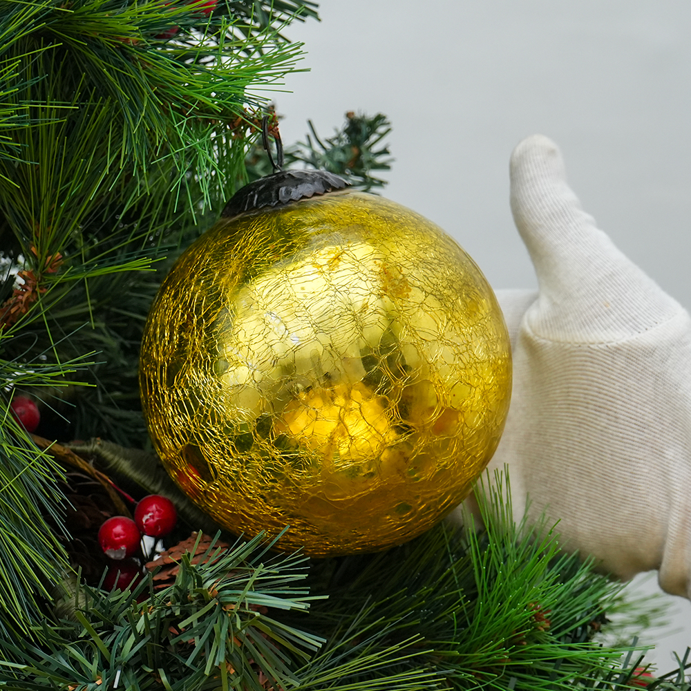 Gold Decorative Round Kugel Style Crackled Glass Hanging Ornament. Crafted from high-quality glass with a smooth glossy finish, this decorative bauble adds a classic and festive touch to Christmas trees, wreaths, and holiday displays.