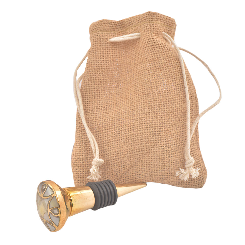 Gold Embroidered Metal Wine Stopper. Zinc Alloy Wine Bottle Stopper with Attractive Jute Bag Packaging.