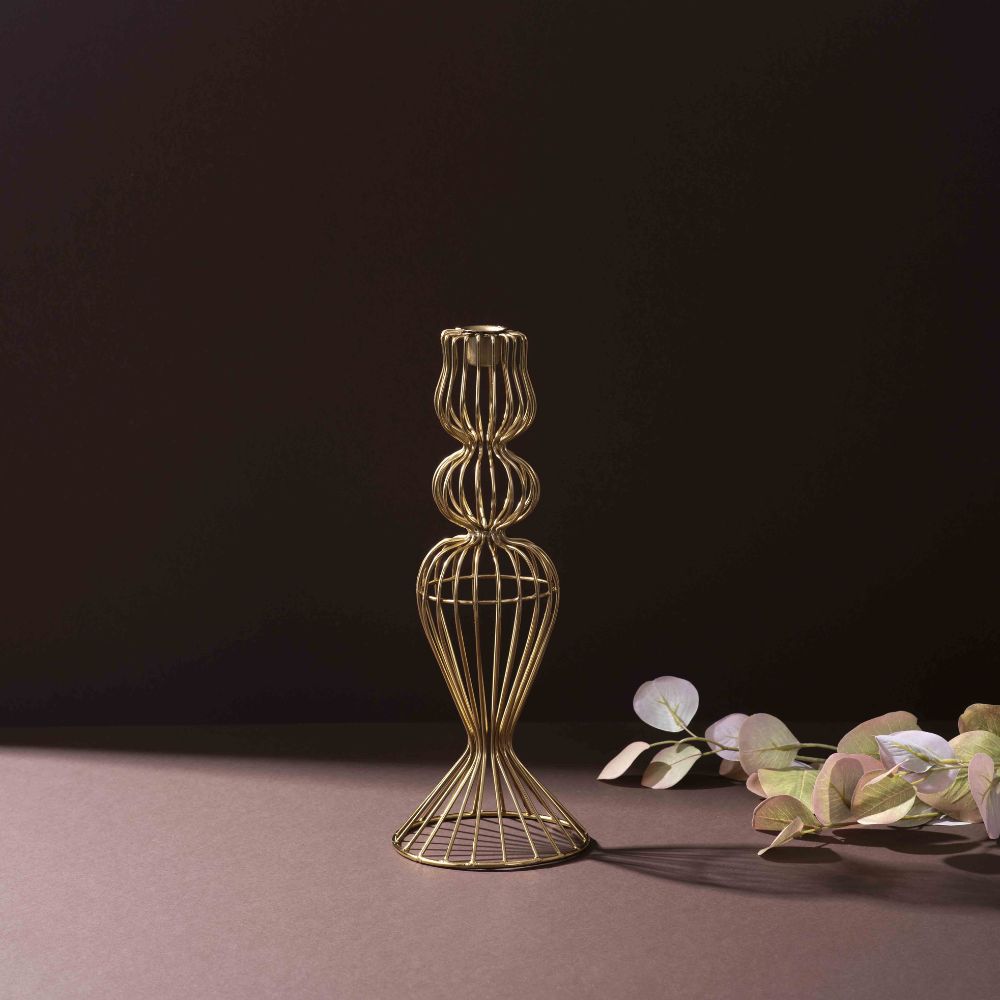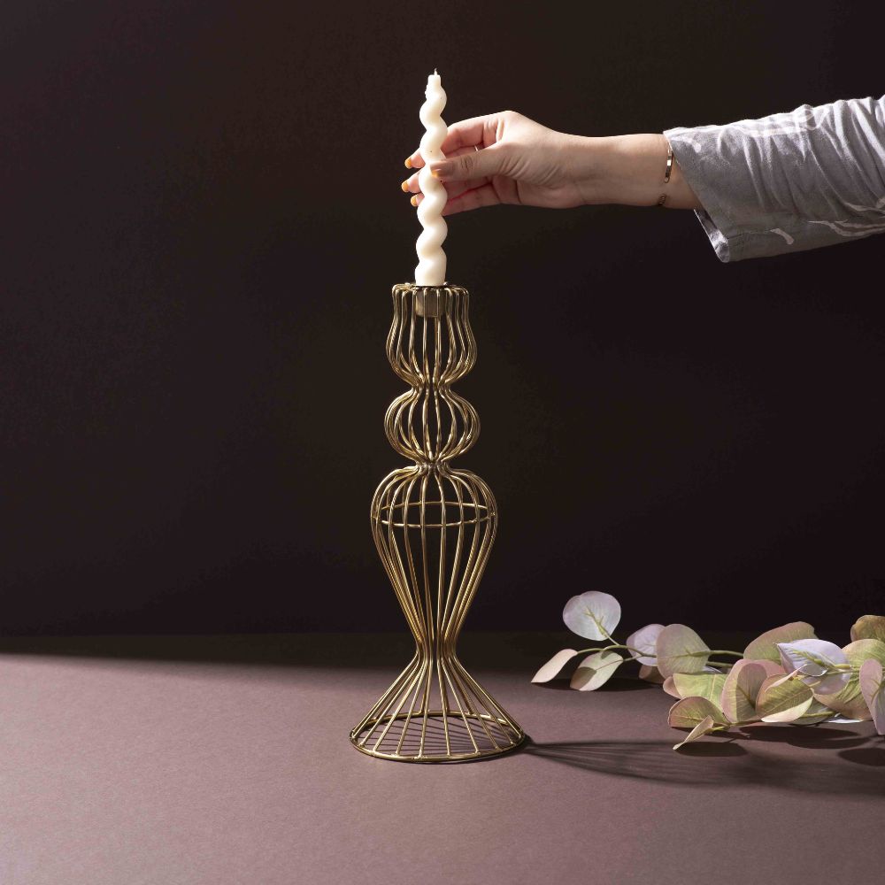 Add a touch of contemporary elegance with the Sirevest Gold Iron Wire Candle Holder. Designed with a minimalist geometric frame in a luxe gold finish, this handcrafted piece beautifully blends form and function. Whether used as a centerpiece or placed on shelves or mantels, it brings warm, ambient lighting to your space. Ideal for tealights or votives, this versatile holder elevates modern, boho, or classic décor themes.
