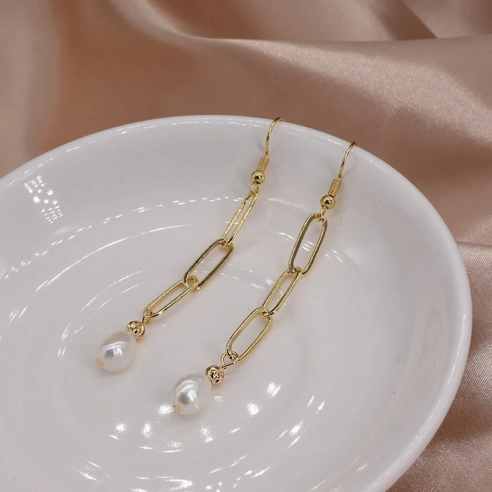 Pair these pearl chain earrings with satin dresses or tailored evening wear, and store them in a soft pouch to preserve the pearl surface and gold finish.