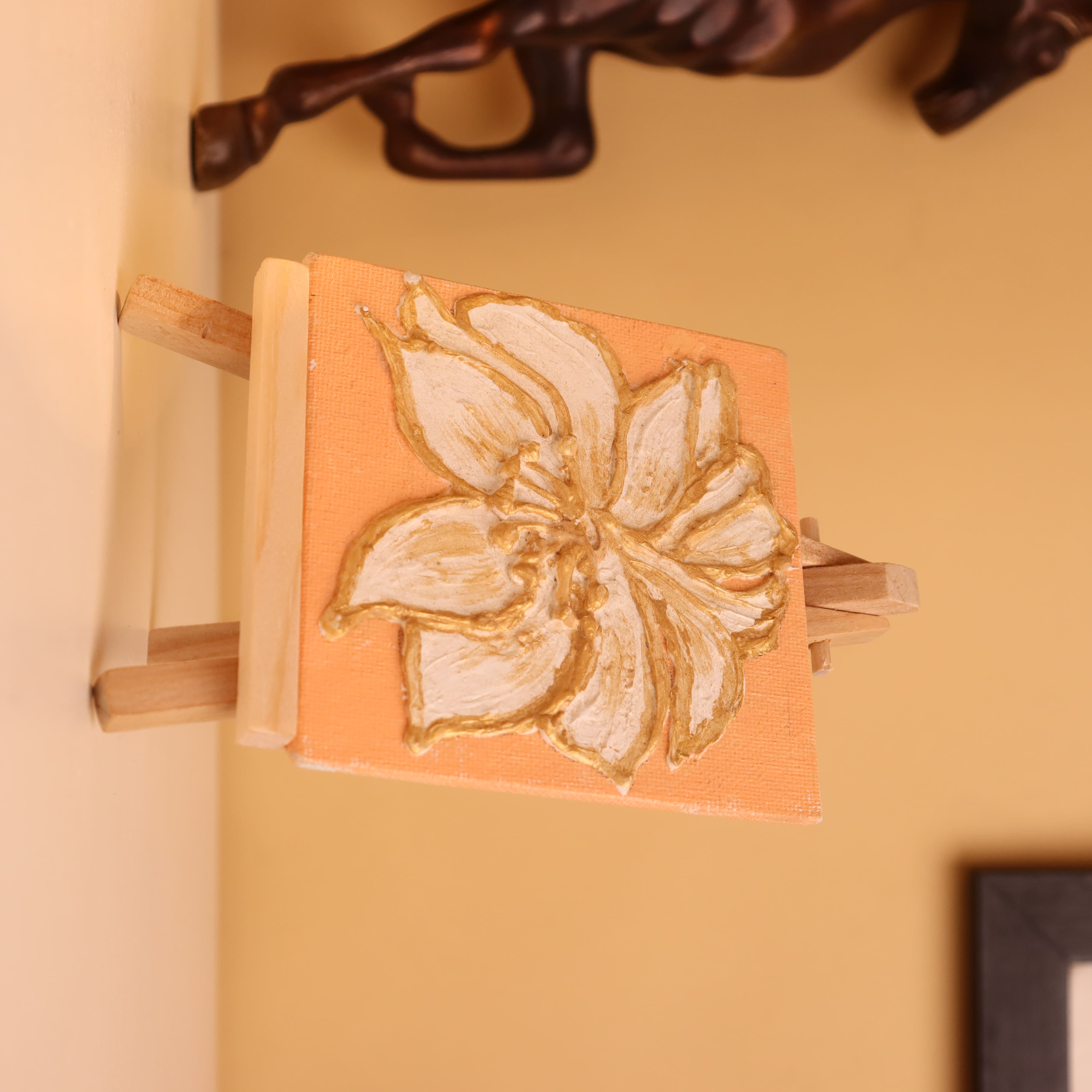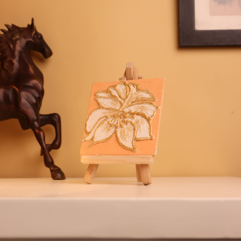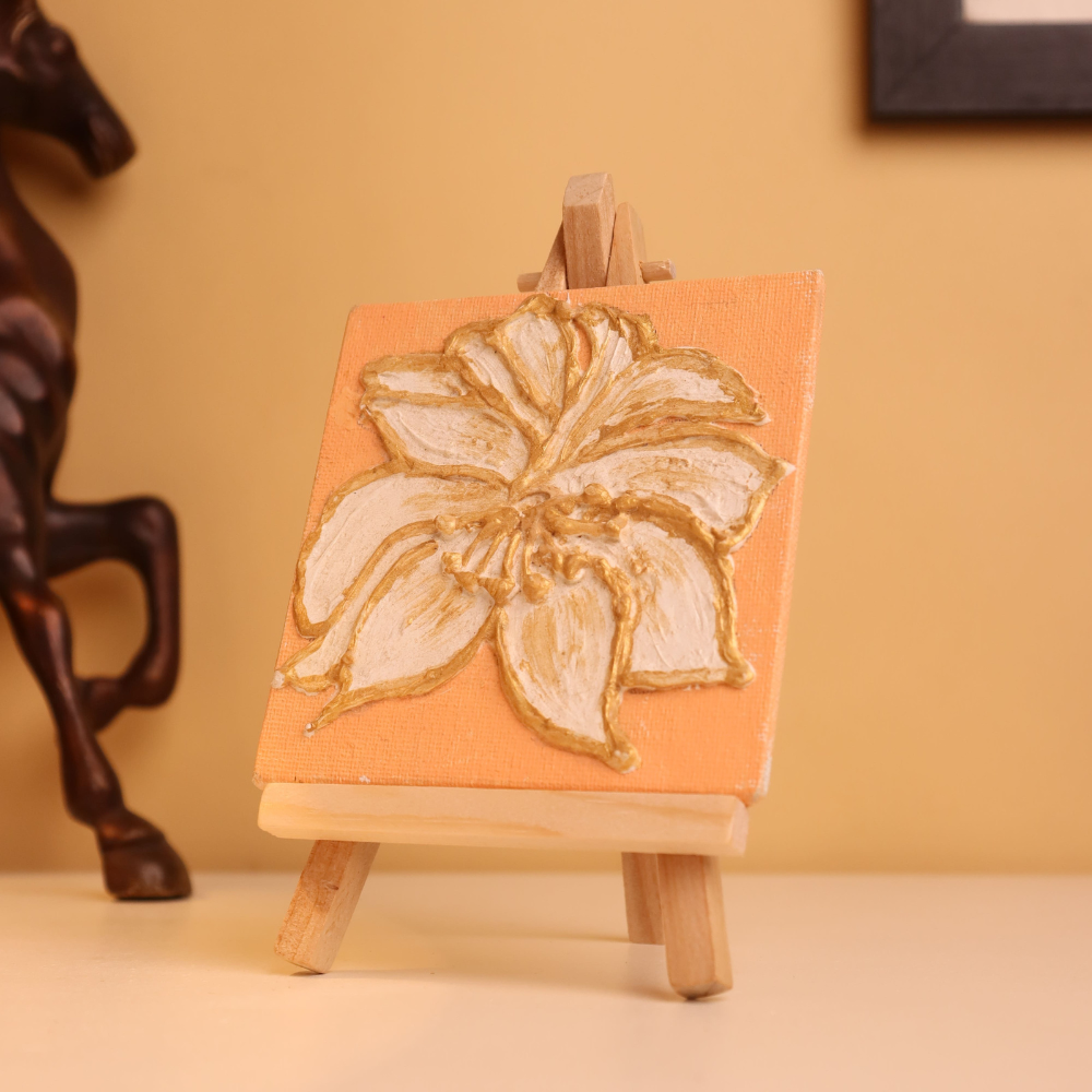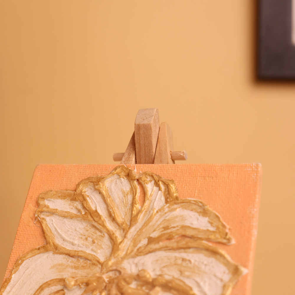 Elevate your decor with this luxurious 4x4 inch mini canvas painting, featuring a hand-textured white flower outlined in shimmering gold. Crafted with precision and care, the raised texture gives this floral artwork a three-dimensional feel, turning a simple bloom into a statement of elegance. The peachy-pearl background adds a warm, subtle glow, enhancing the richness of the golden accents. Each petal is sculpted using thick, textured paint, and delicately detailed with gold lining, creating a regal and tactile experience. Ideal for compact display spaces such as desks, shelves, or bedside tables, this miniature artwork arrives with its own wooden easel for instant presentation. Whether as a thoughtful handmade gift or a stylish touch to your own interiors, this floral piece brings both texture and timeless charm to any setting. Perfect for lovers of botanical art, metallic accents, and chic minimalism, this canvas is a glowing blend of nature and luxury.