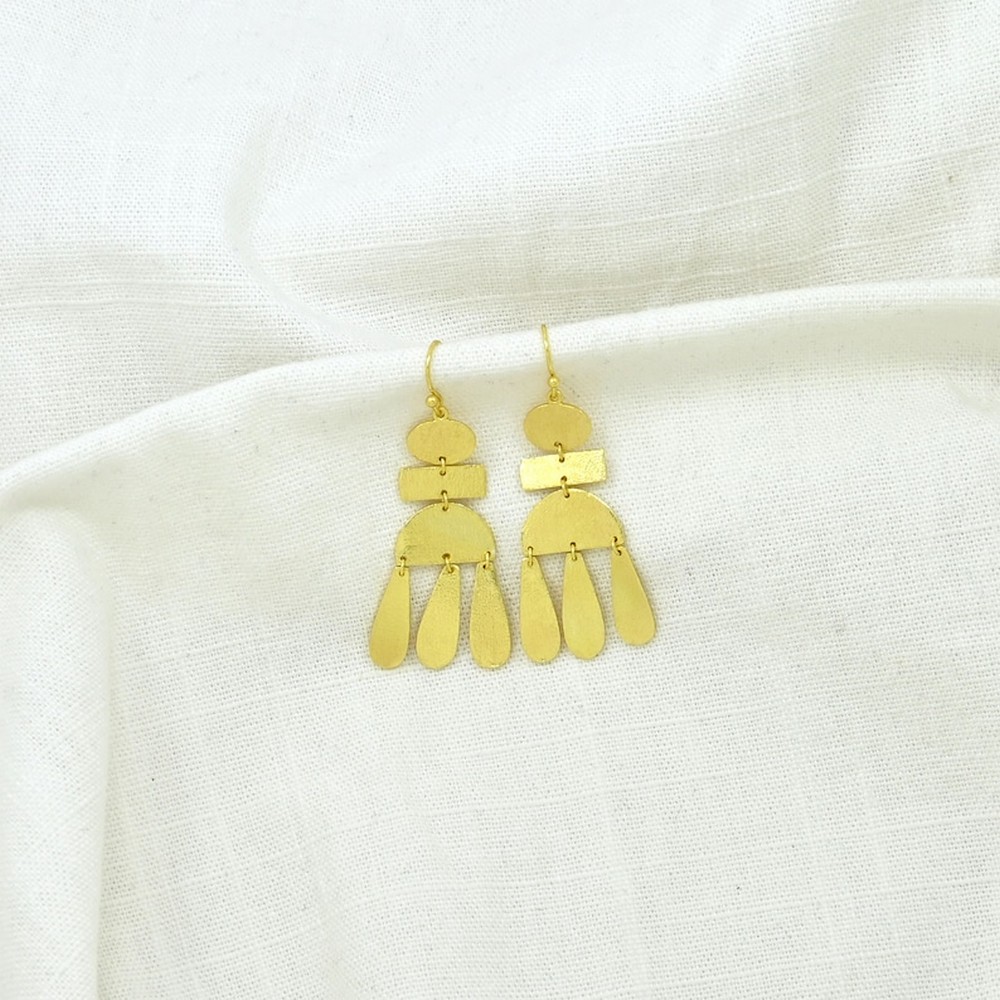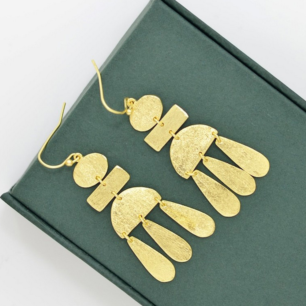 Bold, artistic, and beautifully detailedour gold plated geometric hammered dangle earrings are designed to make a statement. Featuring a handcrafted arrangement of organic geometric shapes linked together, these earrings offer eye-catching movement and a modern sculptural feel. The hammered finish adds rich texture, making them perfect for women who love unique, gallery-inspired jewellery.