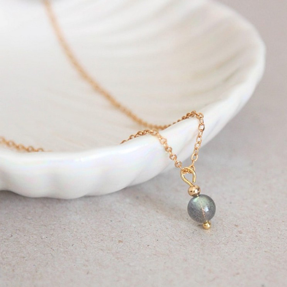 Store the necklace in a dry pouch and avoid contact with perfume, lotion and moisture. Wipe gently with a soft cloth to maintain shine and keep the bead vibrant.