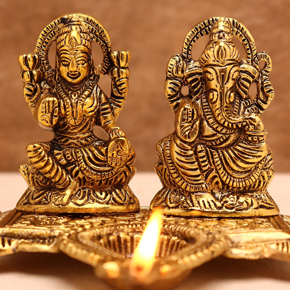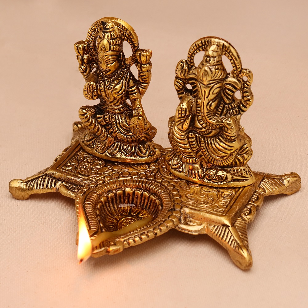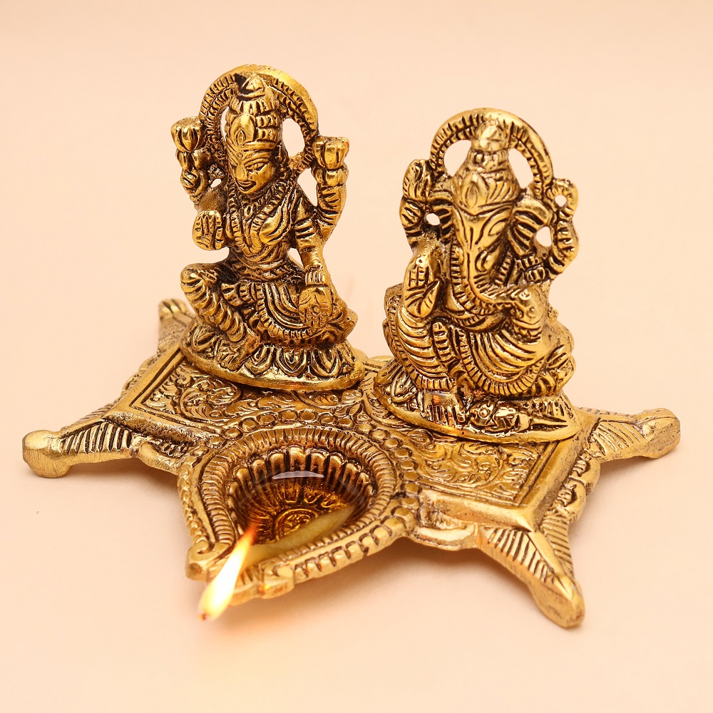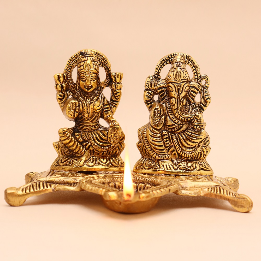 The Golden Aluminium Laxmi Ganesh Diwali Oil Diya Lamp is a product that brings divine light to your home. This artfully designed diya beautifully portrays the designs of Lord Laxmi and Lord Ganesh to bring prosperity, wealth, and good fortune. This golden finish with a traditional look makes it an ideal lamp for your Diwali celebrations or any auspicious occasion.