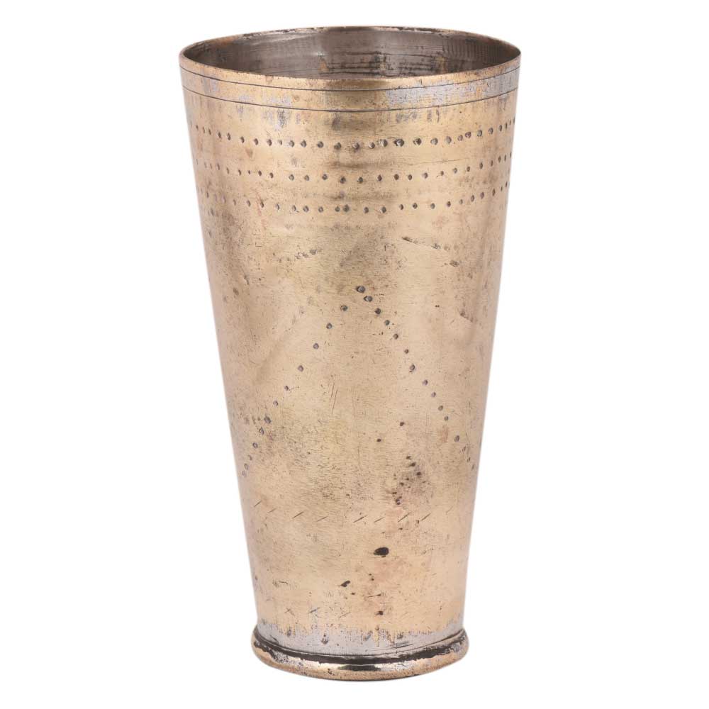 An old golden color brass lassi glass cup has a faded dotted pattern .It is hand made by the expert craftsmen of India using traditional tools and methods. Great gift for your near and dear ones on diwali, Christmas , new year and house warming.