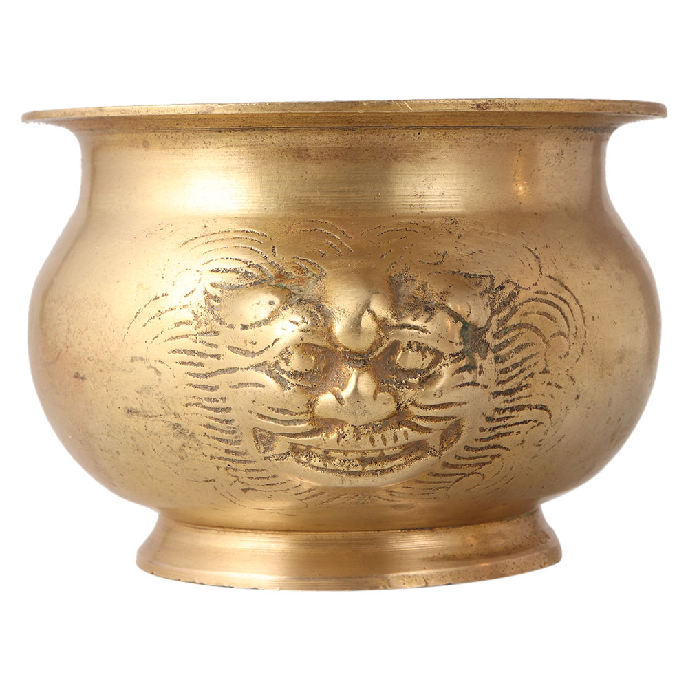 A gold-coloured brass Lota water pot is engraved with two embossed lion faces in Chinese art. The Lota is an important element in all Hindu rituals and temples, as it is used to hold sacred water, rice, precious stones or gold coins. Offer water to the sun in the morning by using the attractive Lota. It makes you disciplined and keeps your body and mind balanced. It is often used to keep Gangajal (sacred water from the river Ganga) in the house and temples. A charming gift for New Year, anniversary or birthday to your friends and relatives.