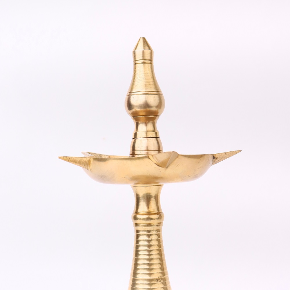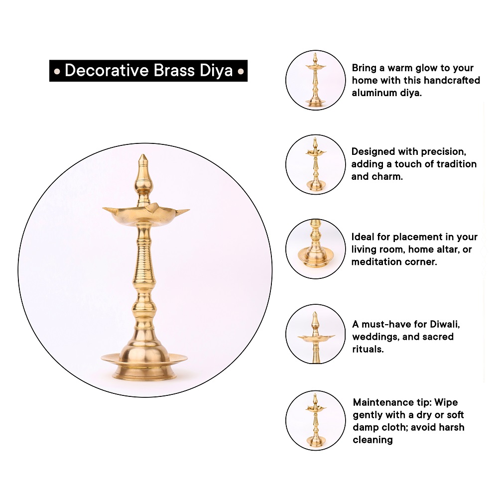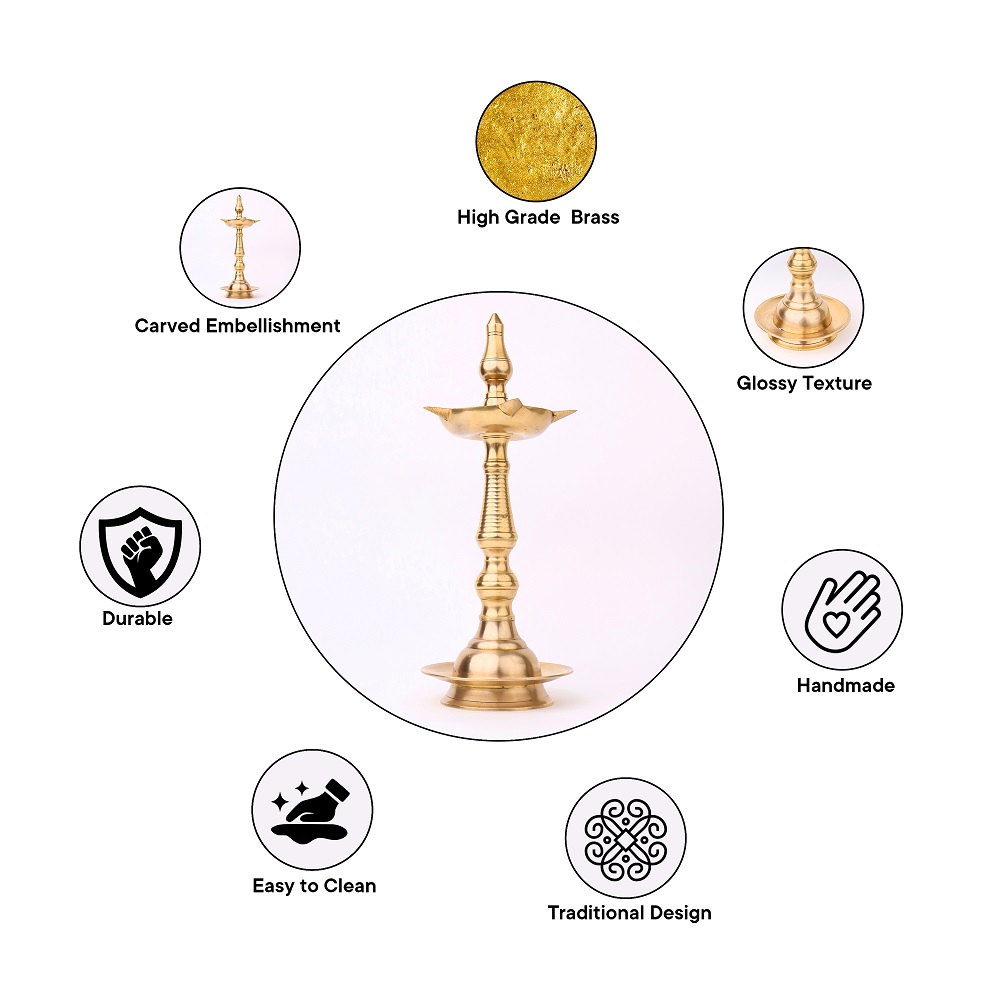 Embrace the splendour of this Brass Oil Lamp with 5 Jyots, a true embodiment of craftsmanship, spirituality, and timeless beauty. A timeless piece that embodies the rich cultural heritage of India. Crafted with utmost precision by professional Indian artisans, this lamp is a testament to their mastery and devotion. Its gleaming golden finish, made possible by the use of high-quality brass, immediately captivates the beholder, making it an enchanting addition to any space. Designed for both functional and decorative purposes, this lamp can accommodate five cotton wicks soaked in either fragrant mustard oil or traditional desi ghee. When lit, the warm glow emitted by the flames illuminates the surroundings, creating a serene and sacred ambiance. The lamp also features a majestic lingam on the top, symbolizing divinity and spirituality. Versatile in its application, this lamp is commonly used during aarti ceremonies at temples and during Pooja rituals at homes and offices. Moreover, it serves as an incredible gift option for family, friends, or relatives, especially during special, festive, or auspicious occasions.