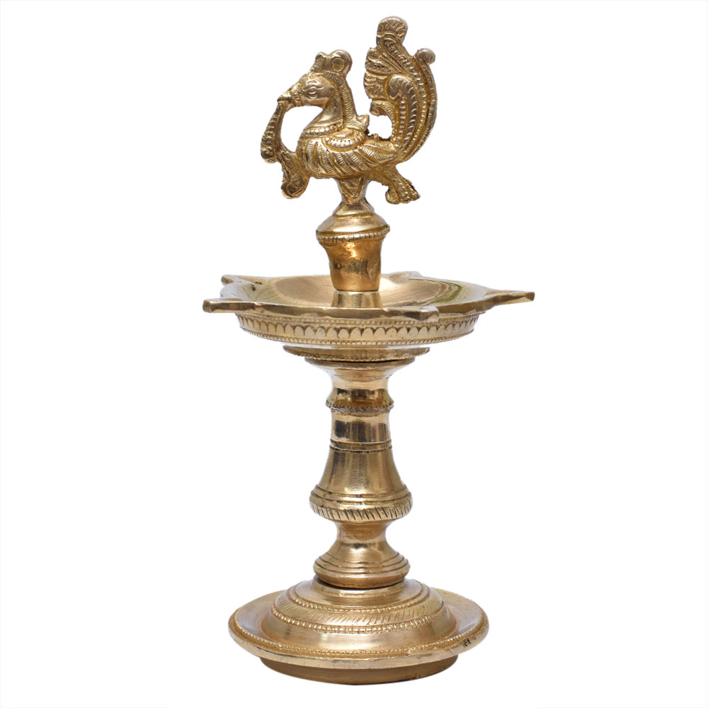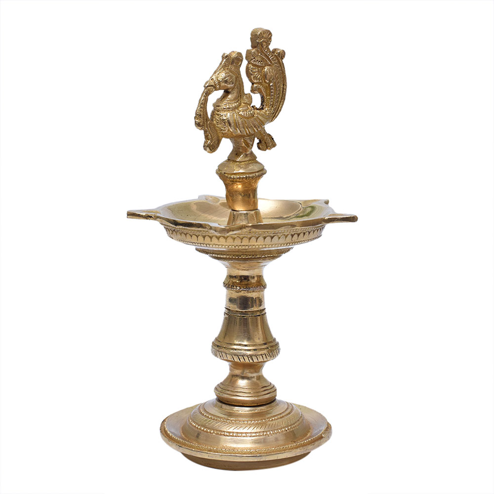 Ideal for worship as well as special occasions or festivals. This traditional brass oil lamp appears to be very attractive and culturally ethnic. It is a lovely brass lamp with a simple traditional design. This gleaming tall brass Lamp or Samai has 5 steps for inserting multiple cotton wicks, and the depth is sufficient to hold more oil for a longer period when lit. The light from these cotton wicks will illuminate the entire altar that will create a devotional atmosphere. This brass Mayil Vilakku oil lamp has a traditional and natural appearance that will undoubtedly add to the ambiance of your home.