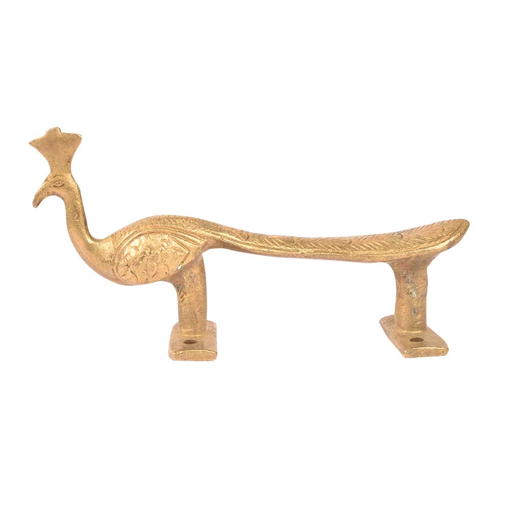 Traditional handmade brass peacock statue as door handle . The door handle has all the details of peacock statue feather and a long tail that is the lowest portion of door handle . It is beautiful color that immediately gives a traditional look to the door it is attach too.