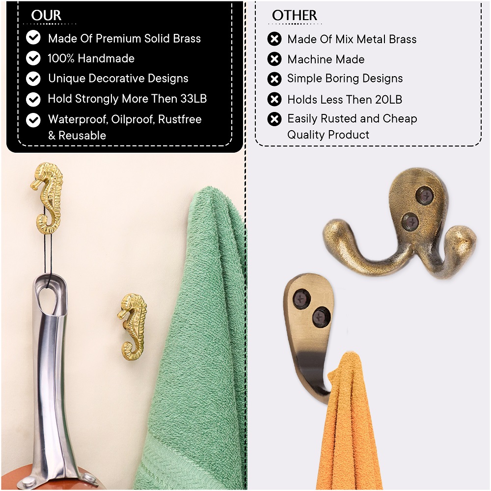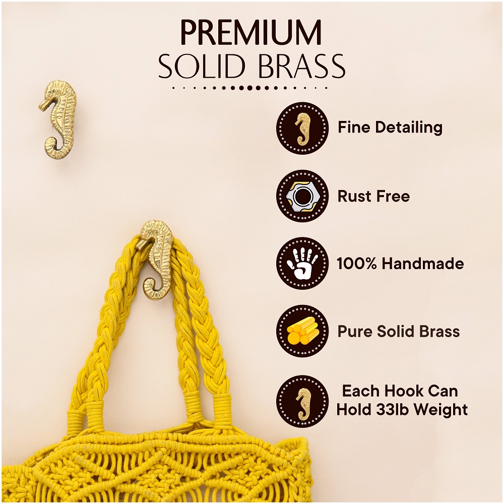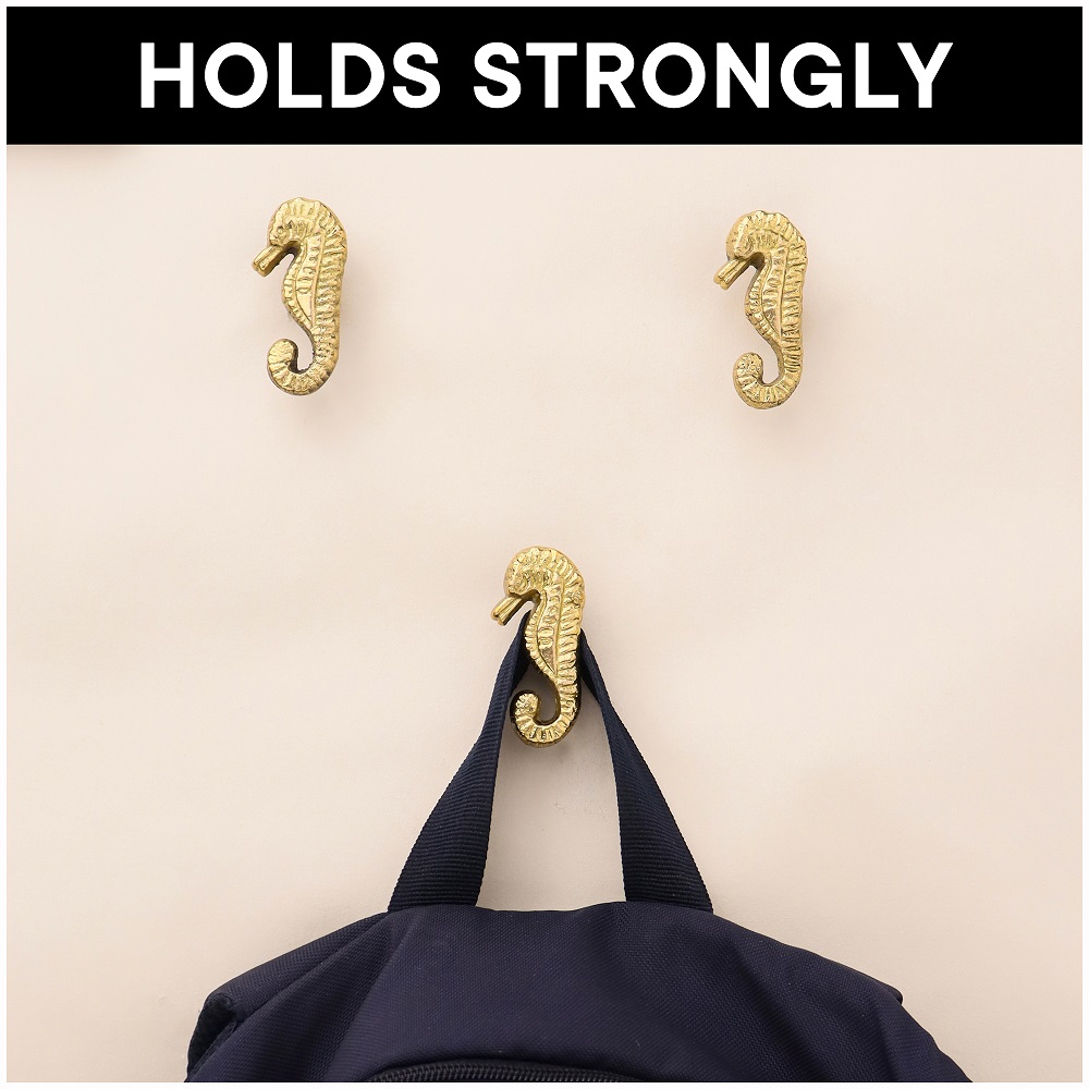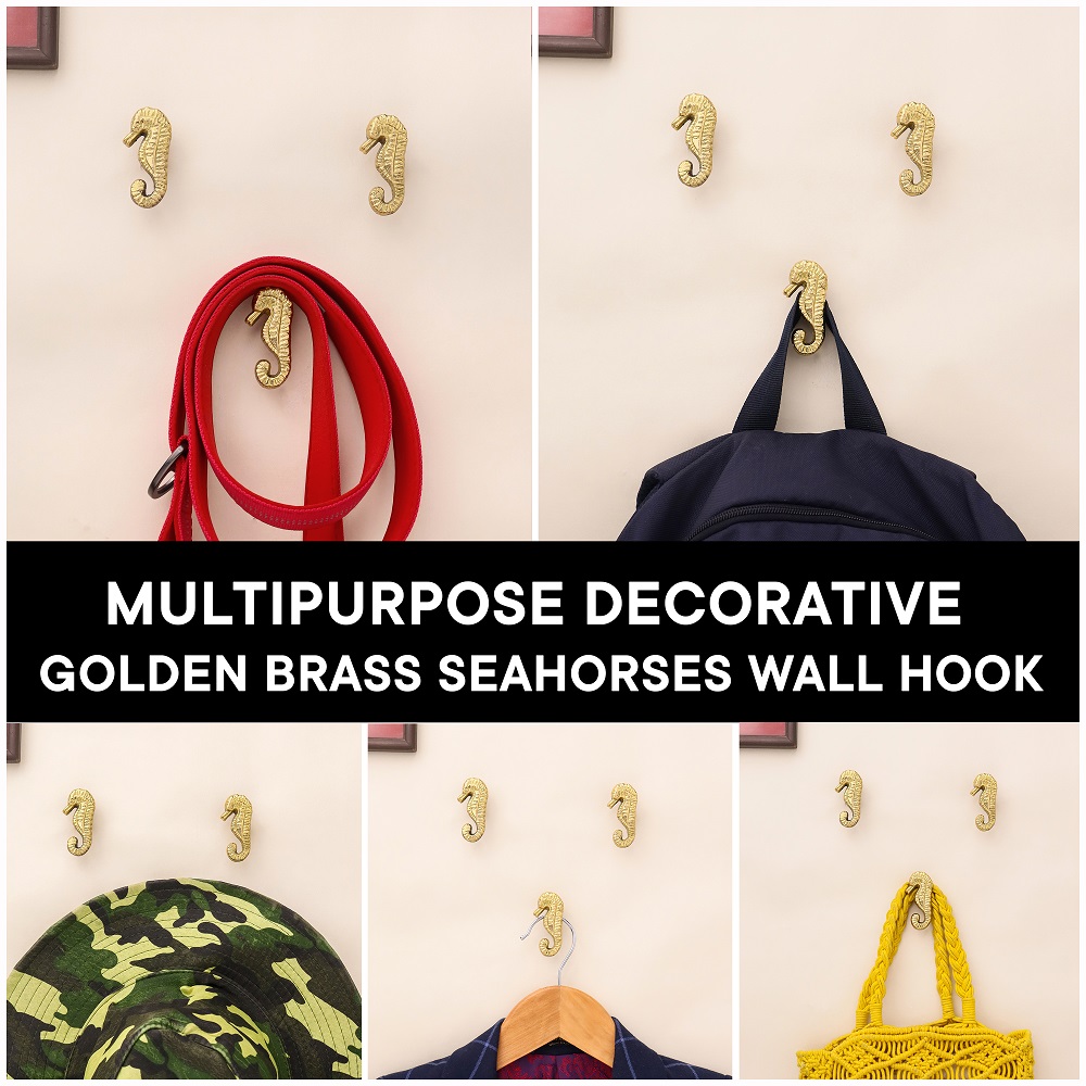 Handmade Golden Brass Seahorse Wall Hooks Set of 3. This Hook is Strong Enough to Hold Your Cloths, Keys, Tea Cups, Coffee Mugs, Hand Towels Etc.