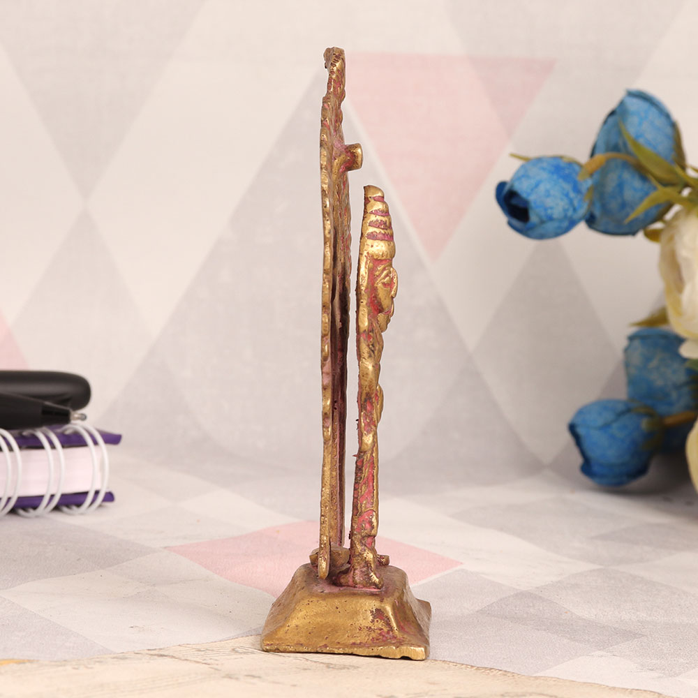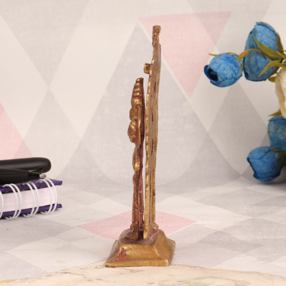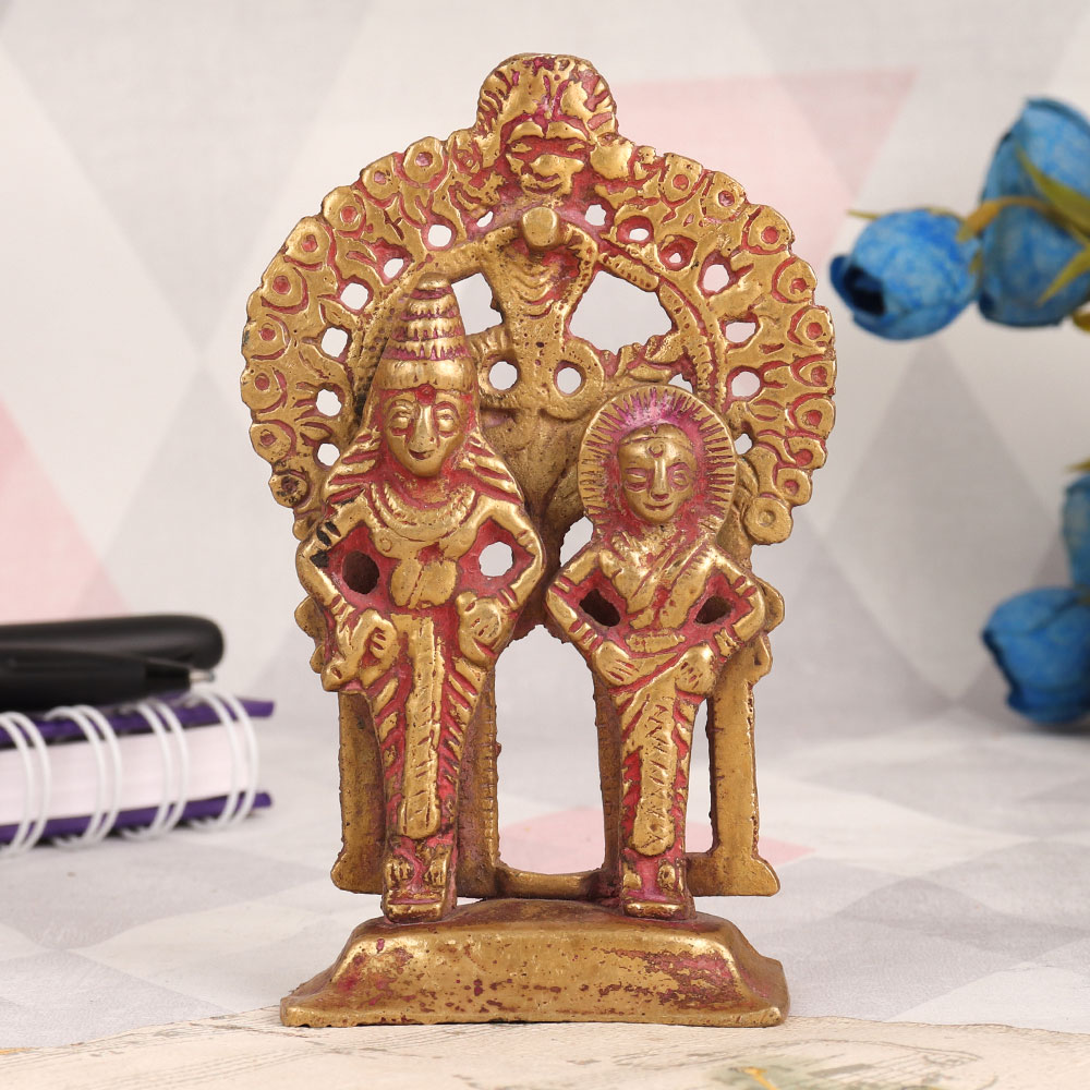 Add a touch of divine elegance to your home, office, restaurant, hotel, or cafe with this exquisite standing brass statue of Lord Shiva and Goddess Parvati, complete with a stunning Prabhavali in an antique golden finish. Handcrafted by highly talented Indian craftsmen, this masterpiece is a testament to their unparalleled craftsmanship. Crafted from high-quality brass, this sculpture not only radiates timeless beauty but also captures the essence of devotion and love. It serves as a perfect centerpiece for your prayer room, invoking a sense of serenity and spirituality during worship. This magnificent piece isn't just for personal use, it's a splendid addition to any vintage collection, lending an air of antiquity and cultural richness to any space. Moreover, it's a captivating exhibit for museums or exhibitions, drawing admirers with its intricate details and historical significance. For those seeking a meaningful and thoughtful gift, this statue is an ideal choice. Present it to your family, friends or relatives on special, festive, or auspicious occasions, and share the blessings of Lord Shiva and Goddess Parvati with them.