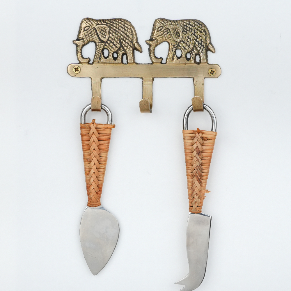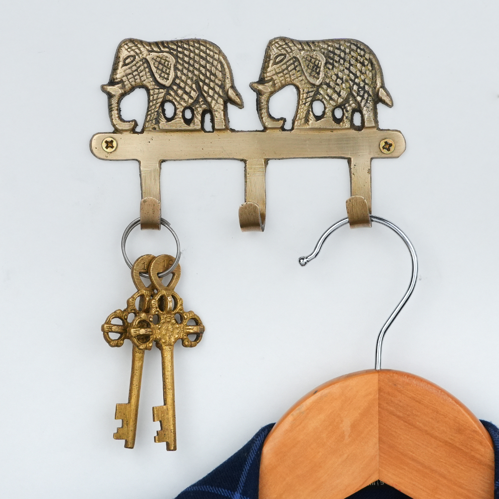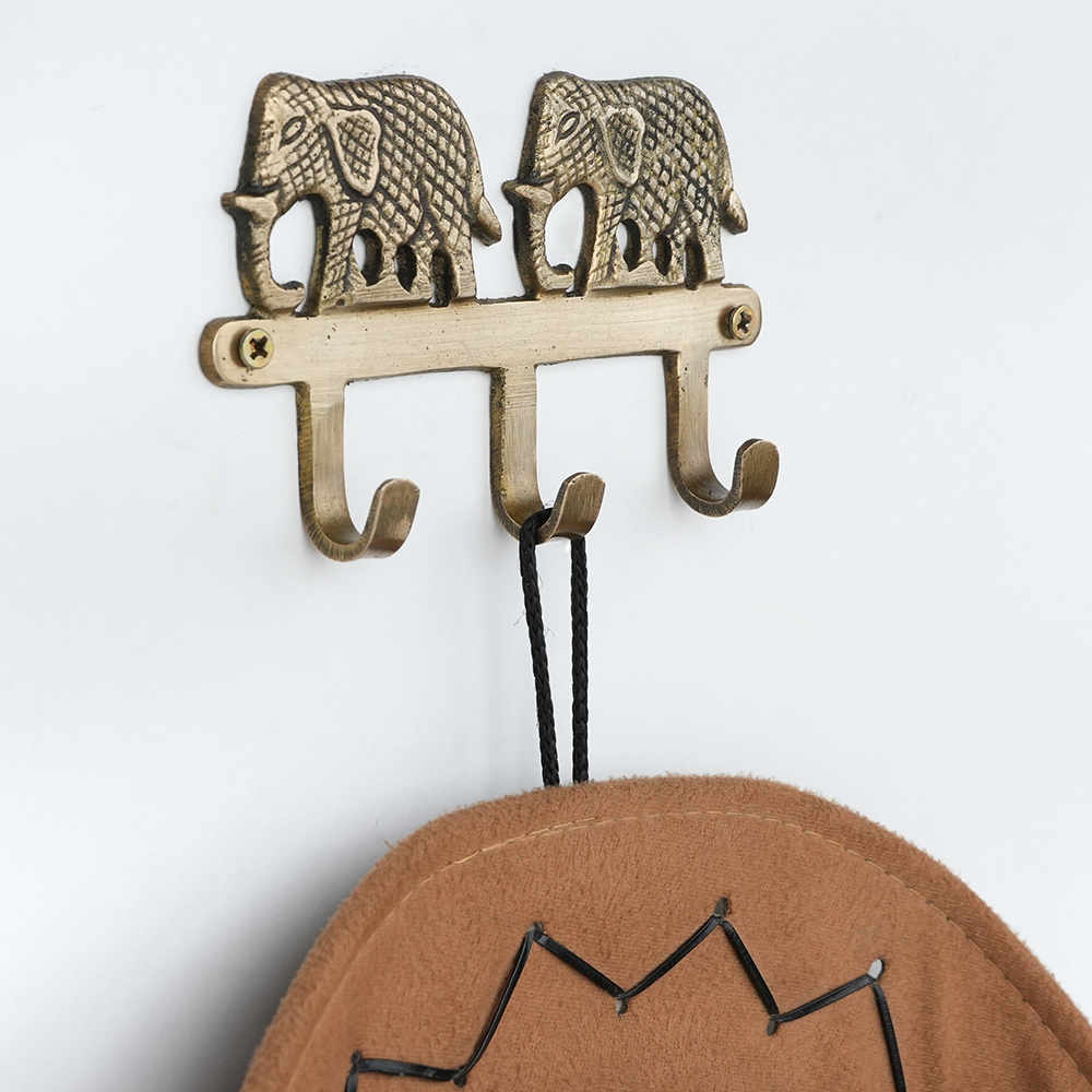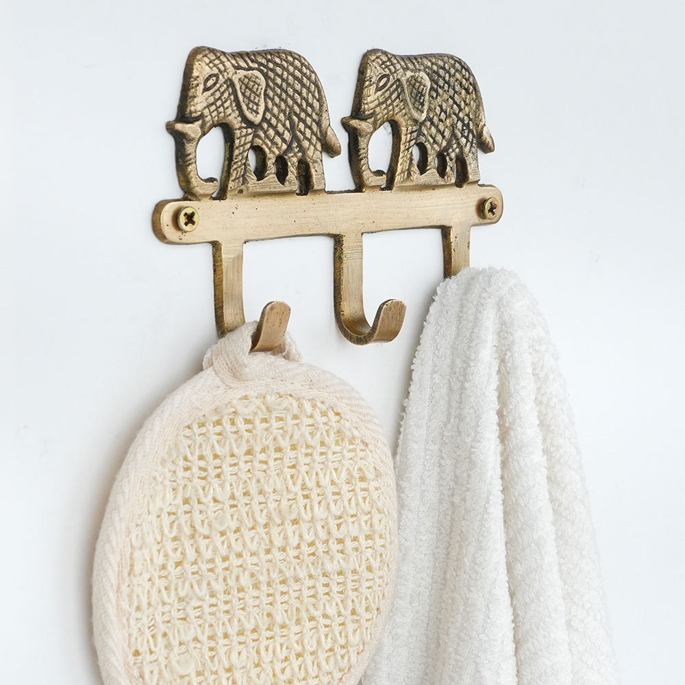 Add a touch of charm and tradition to your space with this handcrafted brass two elephant wall hook. Featuring a beautifully detailed elephant motif, this sturdy hook blends functionality with decorative appeal. Made from solid brass with a warm antique finish, its perfect for hanging keys, coats, scarves, bags, or accessories. Ideal for entryways, bedrooms, or living spaces, this wall hook brings both utility and a subtle cultural accent to your home dcor. Easy to mount and built to last, its a practical piece that doubles as wall art.