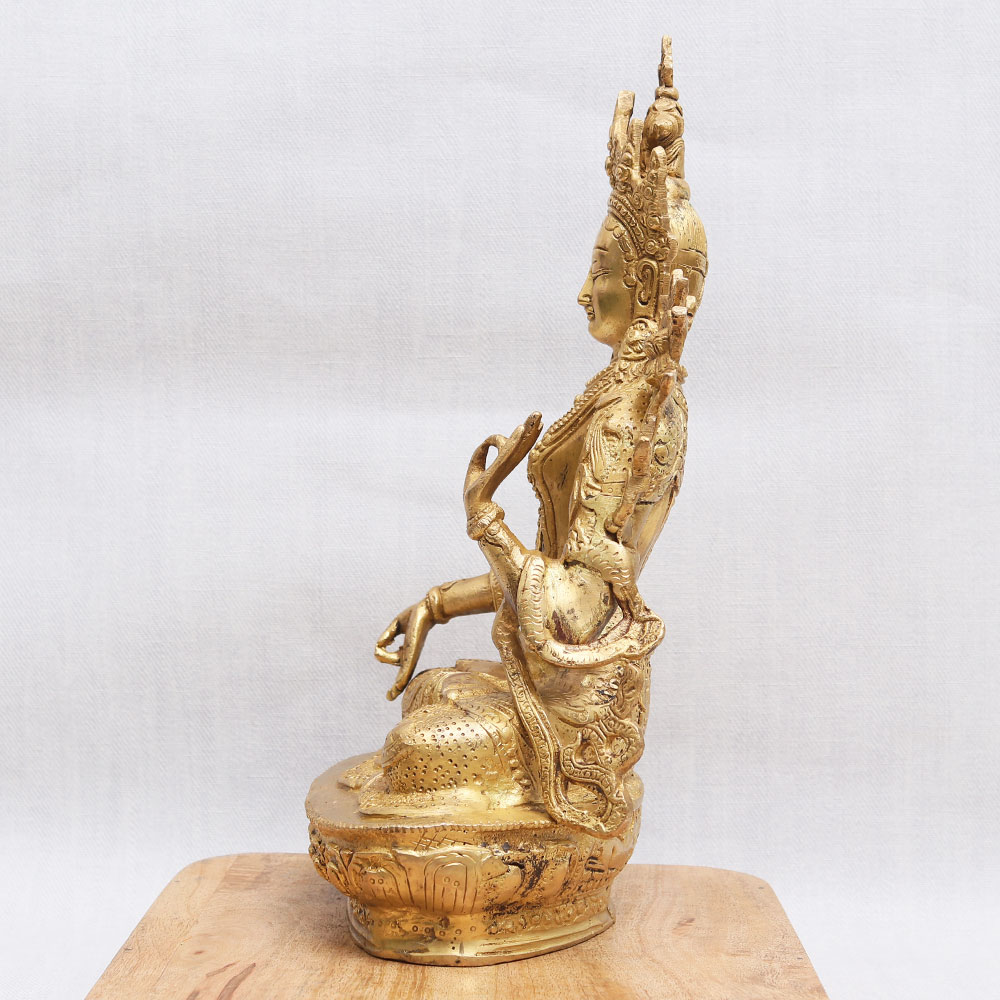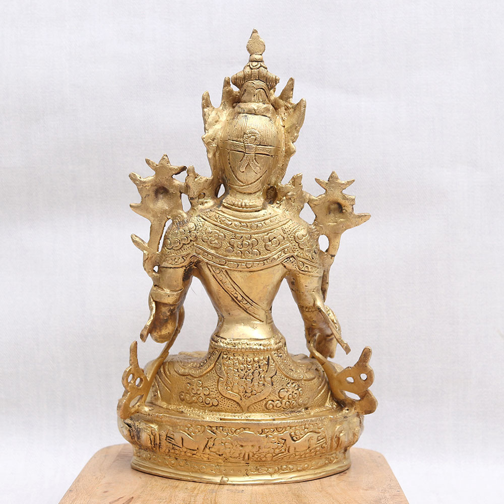 A bronze idol of the revered Tibetan Buddhist Goddess White Tara which is beautifully crafted and adorned in an antique golden finish. Seated gracefully in the Vajra-paryanka posture, this divine statue captures the essence of serenity and compassion that White Tara embodies. Handmade from high-quality bronze by skilled craftsmen, it exudes an undeniable aesthetic charm that adds a touch of elegance to any interior decoration. This enchanting statue of White Tara is not only a sacred object of worship in numerous temples but also a cherished addition to your personal space. Whether you choose to place it in your home, office, cafe, restaurant, gym, or hotel temple, its presence will create an atmosphere of tranquillity and spiritual connection. Furthermore, this divine statue serves as an auspicious gift for your loved ones on special, festive, or auspicious occasions. It embodies the blessings and positive energies associated with White Tara, making it a truly meaningful and cherished present.