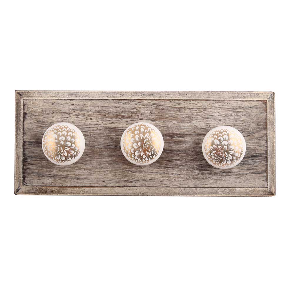 Golden Carnation Flower Flat Ceramic Wooden Hook. A Perfect Complement to the Soft Tone of the Wood are these White Traditional Hat Coat Hook Made of Genuine Porcelain and Brass. It can be use to Hang Jewellery, Leashes, Towels, Scarves, Light Weight Sweaters, Caps Etc.