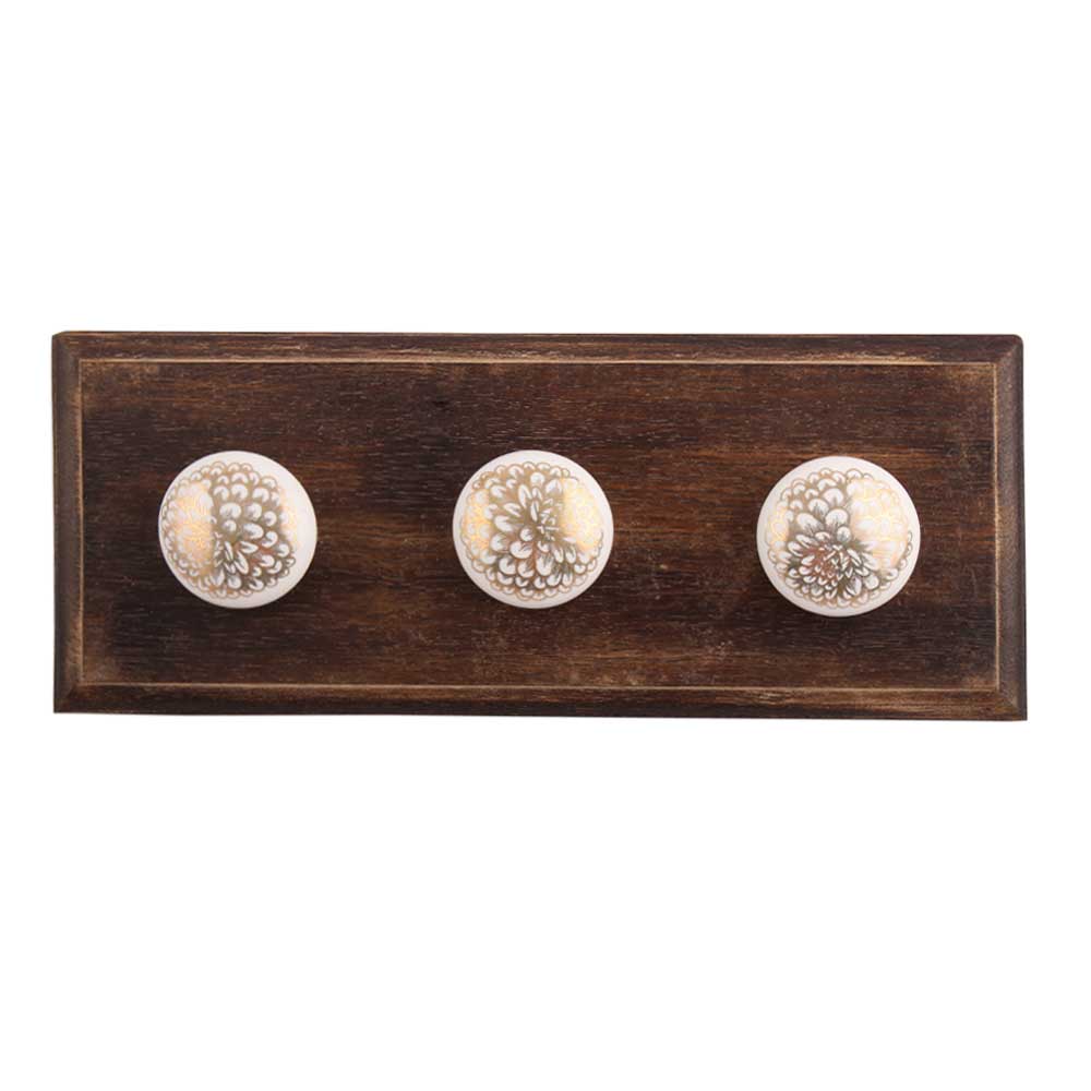 Golden Carnation Flower Flat Ceramic Wooden Hook. A Perfect Complement to the Soft Tone of the Wood are these White Traditional Hat Coat Hook Made of Genuine Porcelain and Brass. It can be use to Hang Jewellery, Leashes, Towels, Scarves, Light Weight Sweaters, Caps Etc.