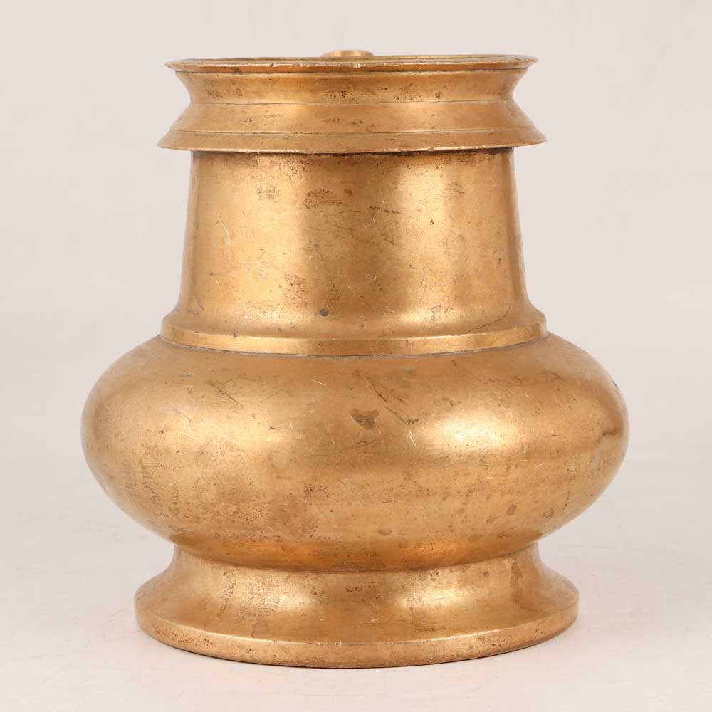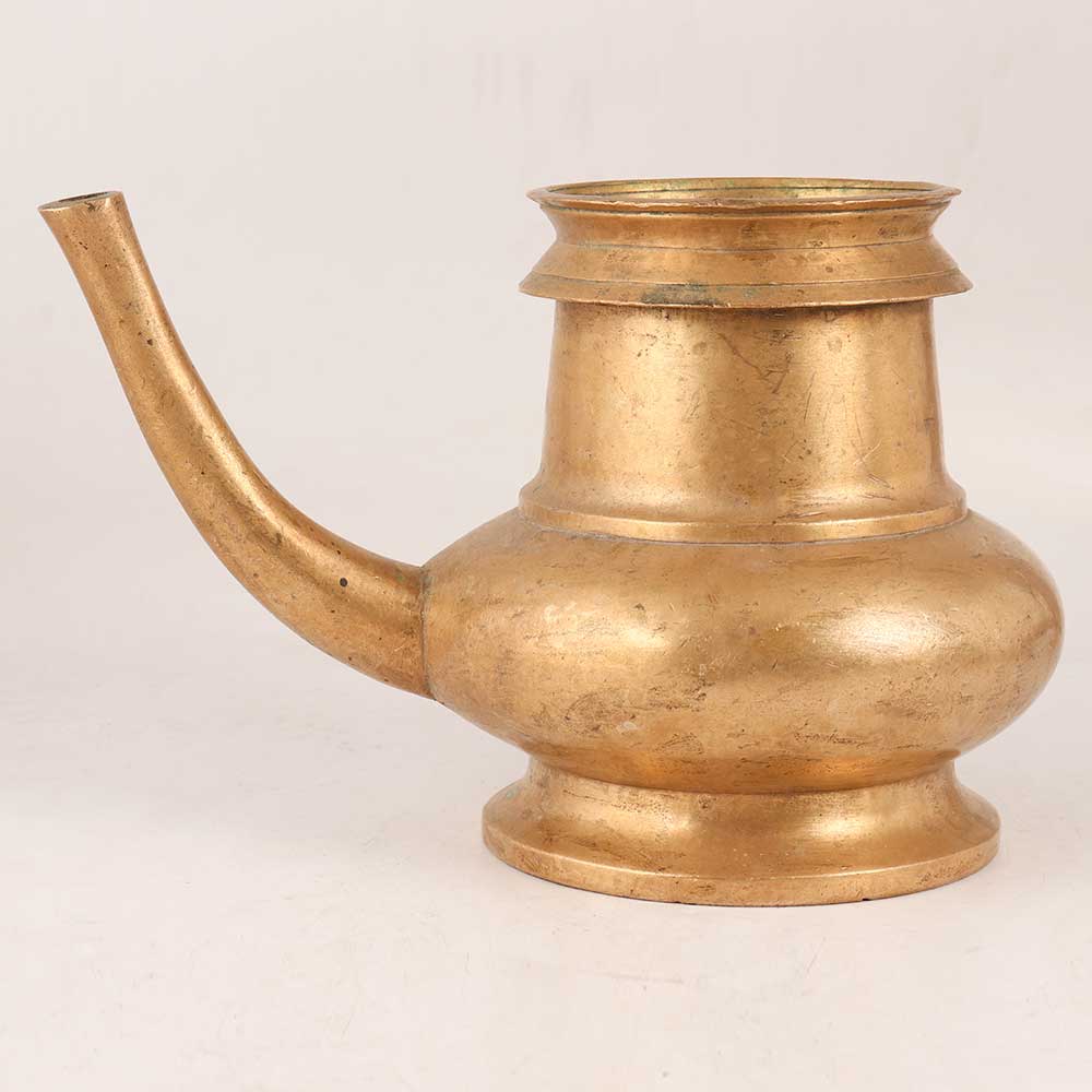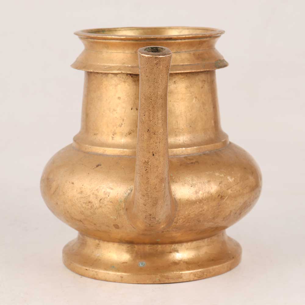 This Brass Holy Water Pot with a long spout is handmade by highly skilled craftsmen from South India. This elegant masterpiece is crafted with precision using high-quality brass and boasts an antique golden finish, adding a touch of timeless charm to any setting. The long-spouted design of this holy water pot ensures a graceful and easy pouring experience, making it a practical addition to homes, offices, restaurants, hotels, or cafes. Its versatility allows it to shine as a decorative centerpiece or as a captivating exhibit in exhibitions and vintage collections. Beyond its aesthetic appeal, this holy water pot holds immense spiritual significance, making it an ideal tool for offering blessings to devotees during religious ceremonies. The pot's sacred aura brings a sense of tranquillity and divine presence to any sacred space. Moreover, this brass holy water pot serves as an extraordinary gift choice for your loved ones on special, festive, or auspicious occasions. Its exquisite craftsmanship and spiritual symbolism make it a thoughtful and cherished present, symbolizing blessings, good fortune, and prosperity.