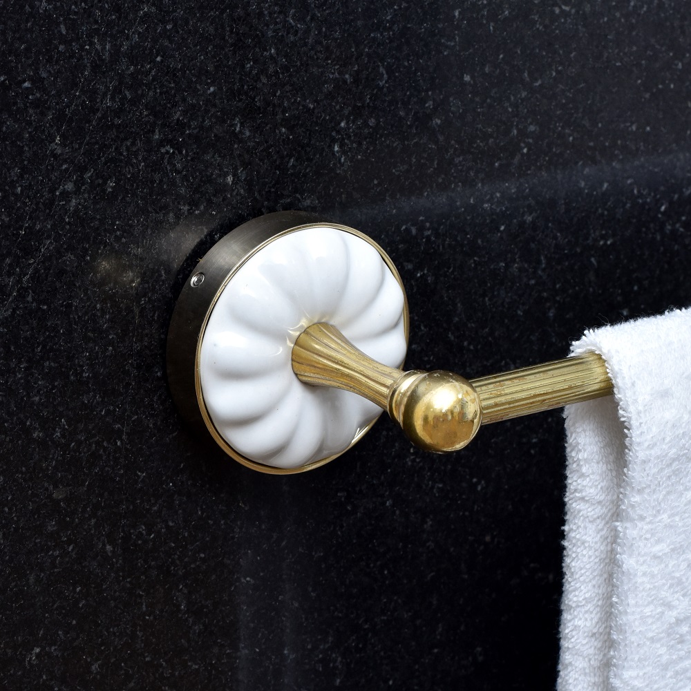 The classic blend of golden brass and ceramic makes this towel hanger perfect for both modern and traditional bathroom designs. Its timeless look will seamlessly integrate into your existing decor, creating an elegant and functional space.