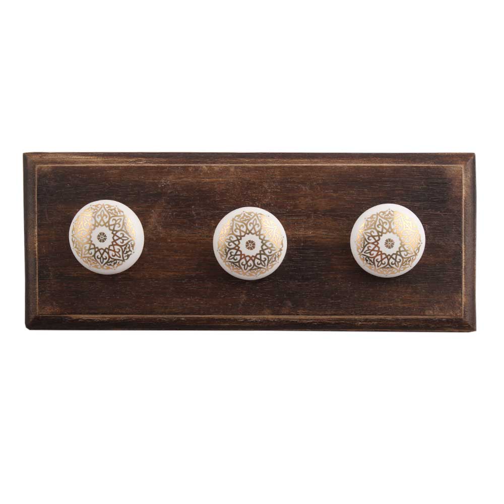 Golden Floral Pattern Flat Ceramic Wooden Hook. A Perfect Complement to the Soft Tone of the Wood are these White Traditional Hat Coat Hook Made of Genuine Porcelain and Brass. It can be use to Hang Jewellery, Leashes, Towels, Scarves, Light Weight Sweaters, Caps Etc.