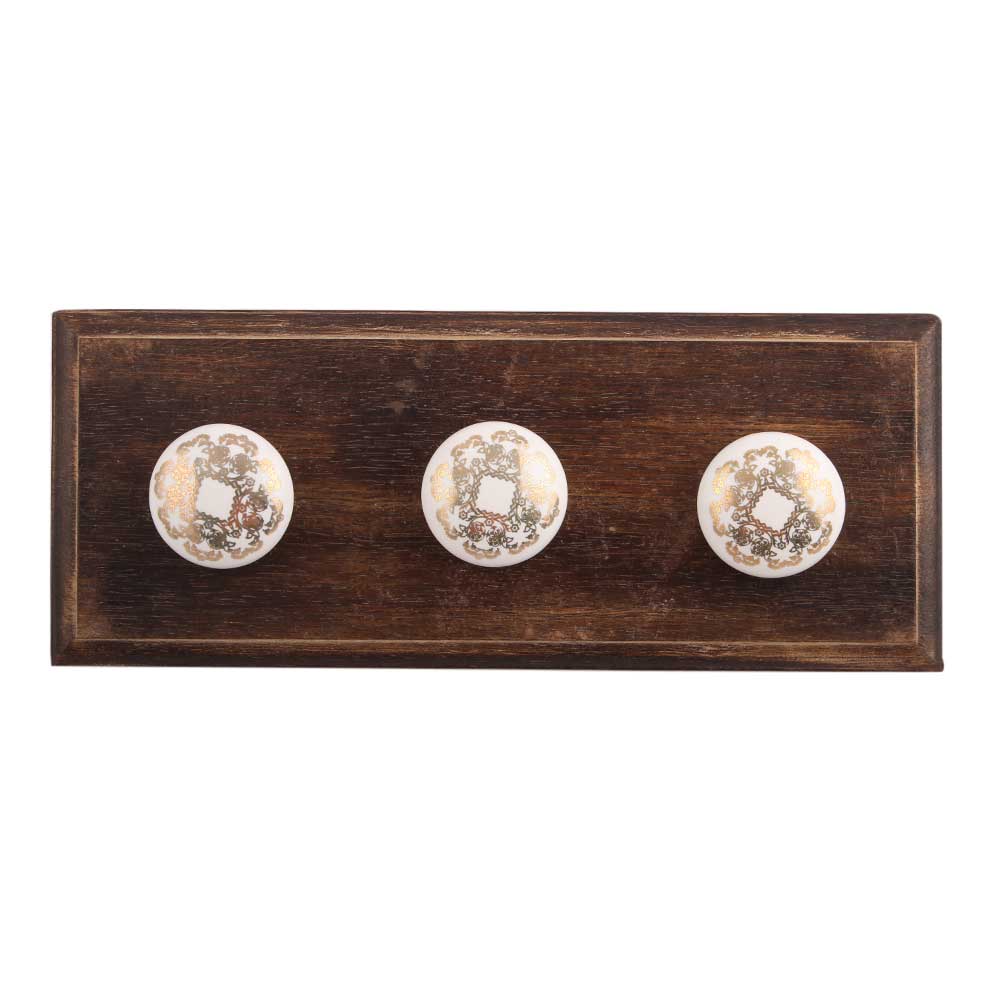Golden Flower Flat Ceramic Wooden Hook. A Perfect Complement to the Soft Tone of the Wood are these White Traditional Hat Coat Hook Made of Genuine Porcelain and Brass. It can be use to Hang Jewellery, Leashes, Towels, Scarves, Light Weight Sweaters, Caps Etc.