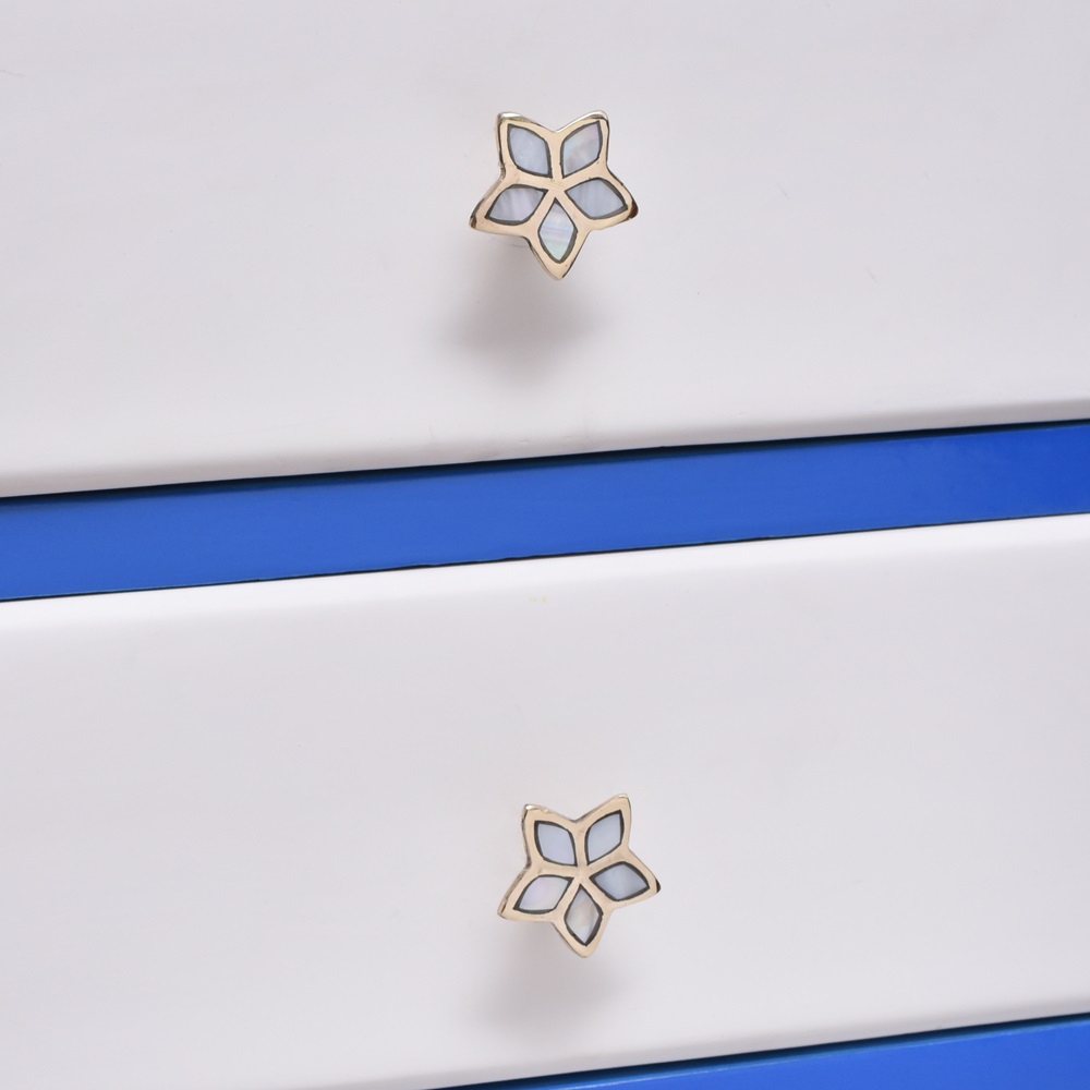Crafted with a stunning combination of mother of pearl and brass, the Golden Flower Dresser Knobs and Pulls offer both visual appeal and durability. The luminous sheen of the mother of pearl catches the light in a beautiful, iridescent glow, while the golden flower motif adds a bold yet refined contrast. This fusion of materials creates a lasting impression, elevating any piece of furniture into a functional work of art.