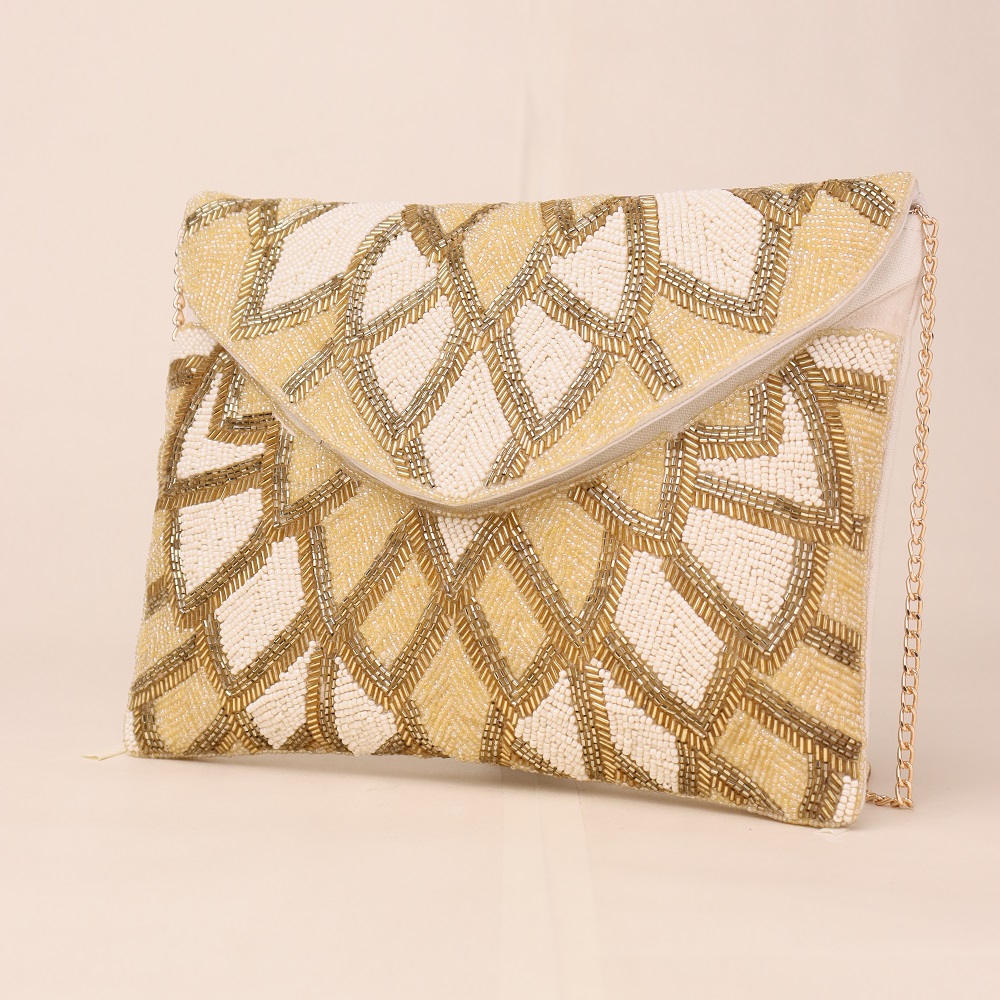 Radiate elegance with this hand-beaded envelope clutch, featuring a stunning petal-like geometric pattern that exudes timeless charm. The soft luster of the beadwork offers a subtle shimmer, making it the perfect accessory for festive occasions, weddings, or elegant evenings out. The detachable gold chain strap adds versatility, allowing you to style it as a shoulder bag or carry it as a statement clutch.