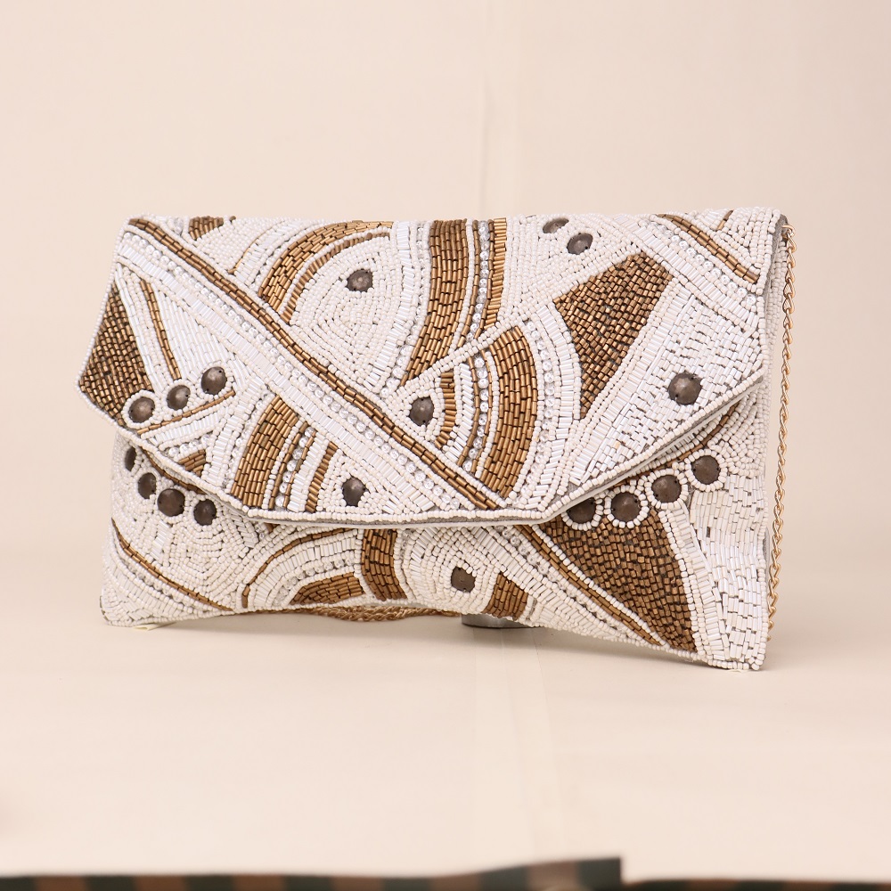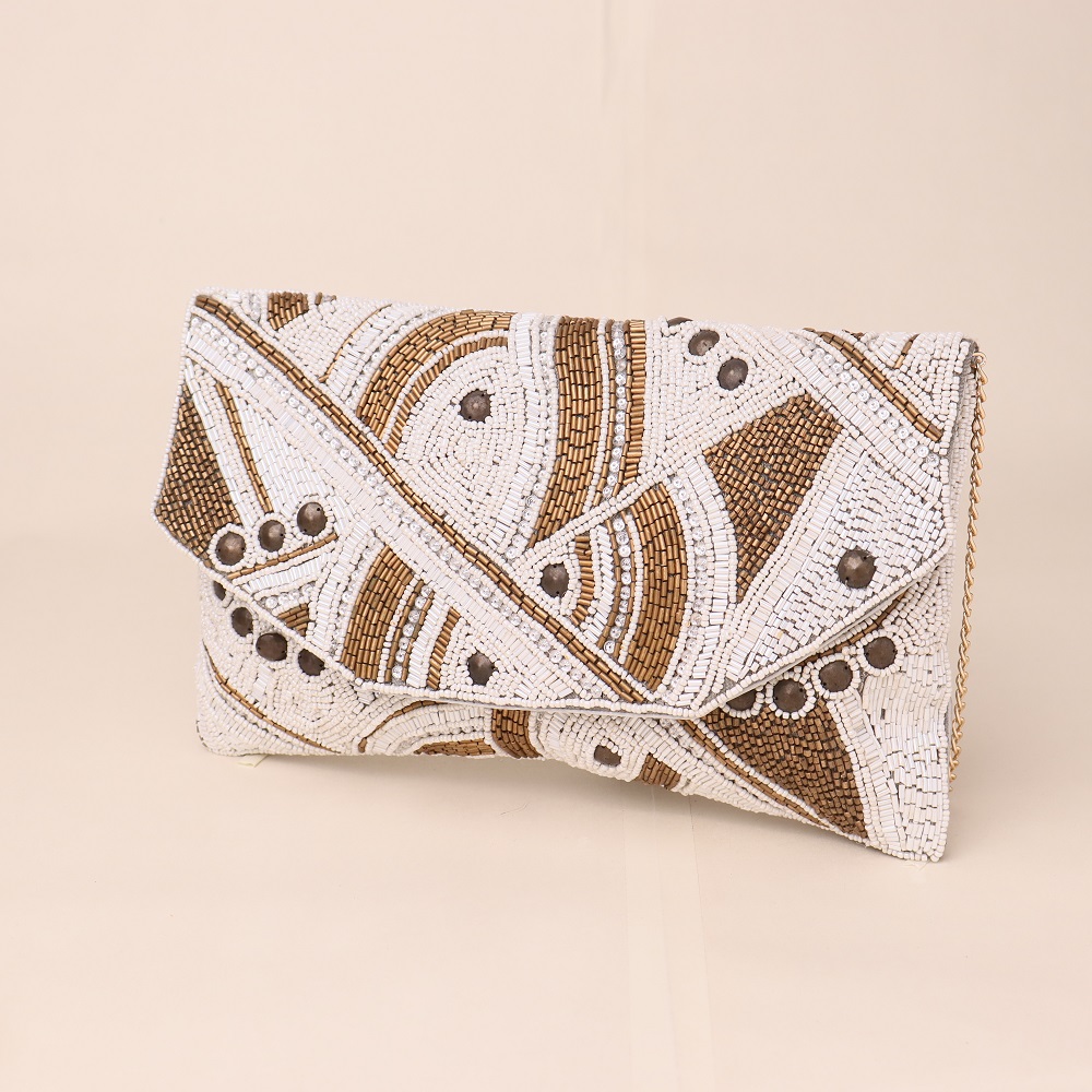 Radiate elegance with this hand-beaded envelope clutch, featuring a stunning petal-like geometric pattern that exudes timeless charm. The soft luster of the beadwork offers a subtle shimmer, making it the perfect accessory for festive occasions, weddings, or elegant evenings out. The detachable gold chain strap adds versatility, allowing you to style it as a shoulder bag or carry it as a statement clutch.