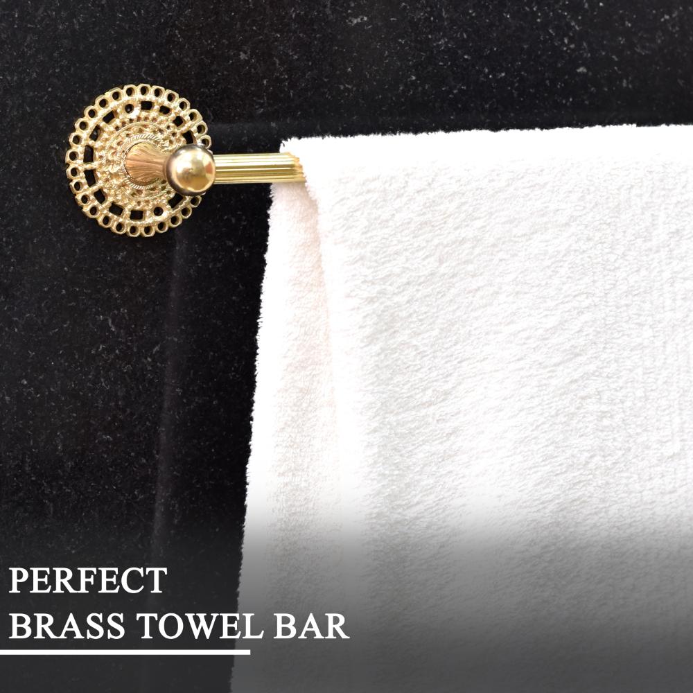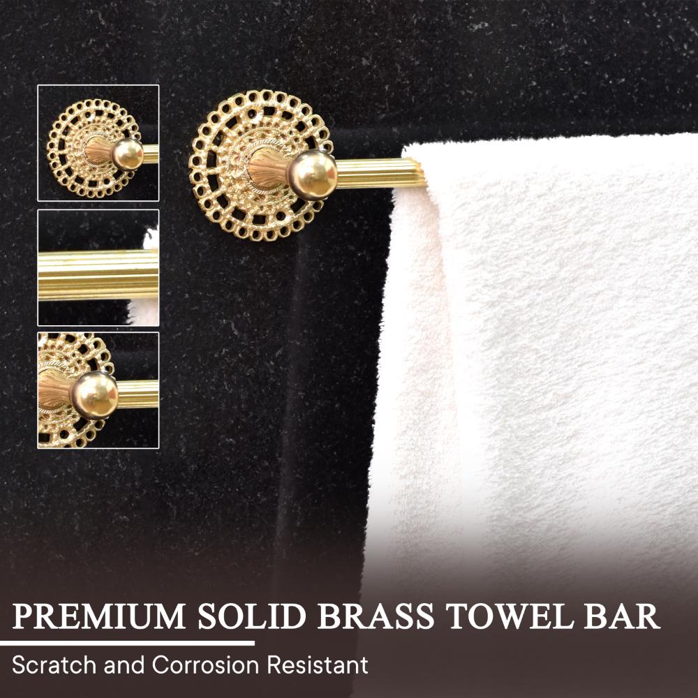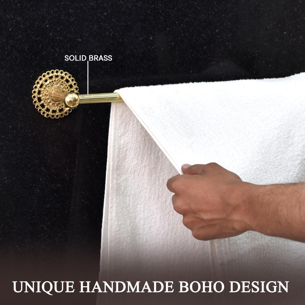 Add a touch of elegance to your bathroom decor with this stunning brass towel hanger. Crafted from durable brass metal with an eye-catching golden finish, this towel holder will make a beautiful addition to any bathroom. With its timeless golden colour and sculpted shape, this brass towel holder brings a hint of luxury to an often-overlooked area. The metal construction is made to last, so you can enjoy its beauty and functionality for years to come. If you want to enhance your bathroom's style with a little metallic shine, this brass towel hanger is just what you need. Its charming curling design provides plenty of space to neatly hang towels while complementing modern or traditional decor. Give your bathroom an instant upgrade with this elegant essential.