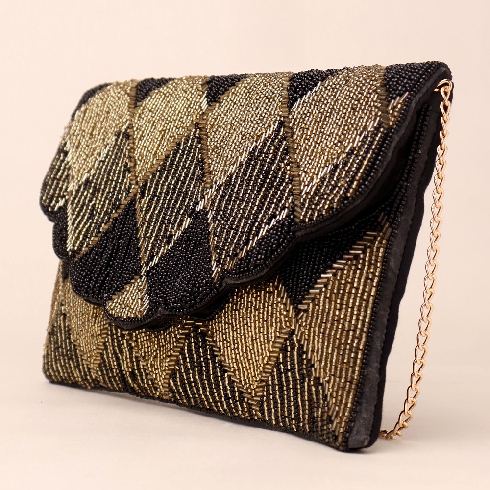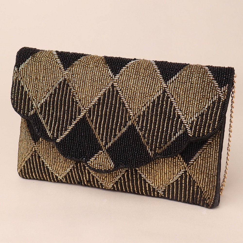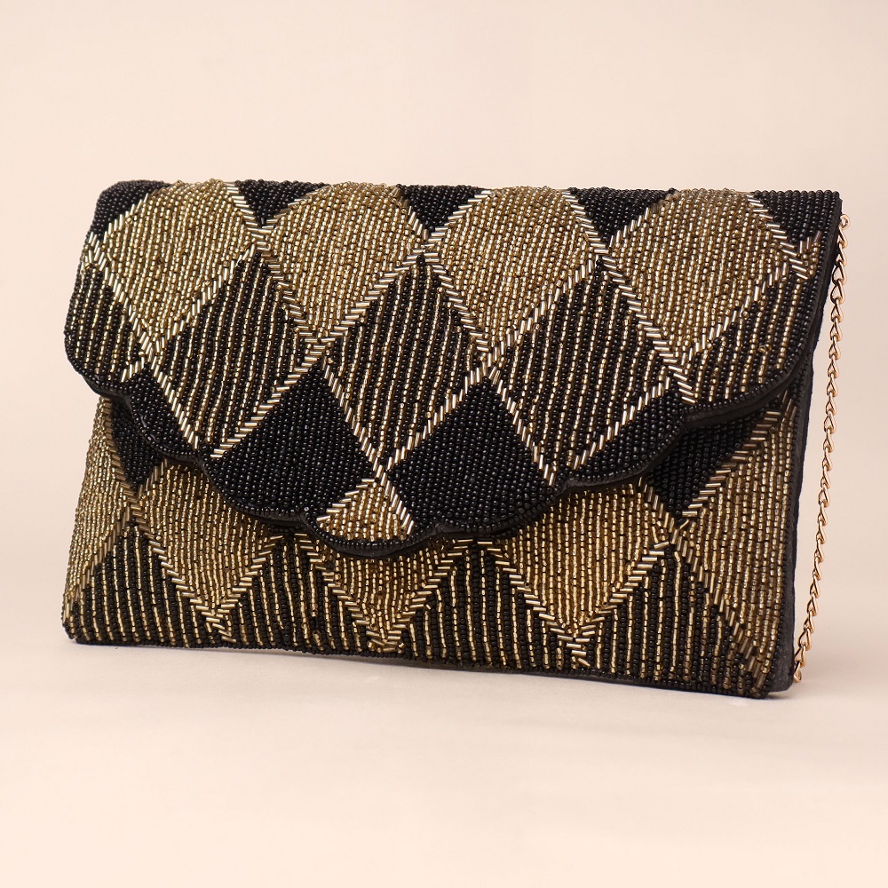 Elevate your evening look with this striking hand-beaded clutch featuring a sophisticated lattice pattern. The contrasting geometric beadwork creates a rich texture, perfect for formal gatherings or cocktail soirées. Designed with a scalloped flap and metallic chain strap, it transitions effortlessly from a statement clutch to a graceful sling bag, offering elegance with every detail.