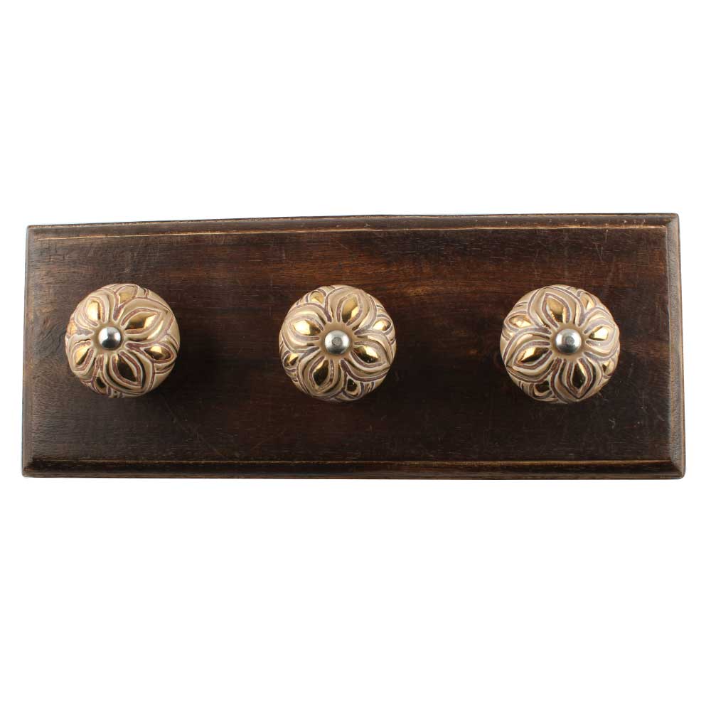 Golden Leaf Ceramic Floral Wooden Hook. A Perfect Complement to the Soft Tone of the Wood are these White Traditional Hat and Coat Hook Made of Genuine Porcelain and Brass. It can be used to Hang Jewelry, Leashes, Towels, Scarves, Light Weight Sweaters, Caps etc.