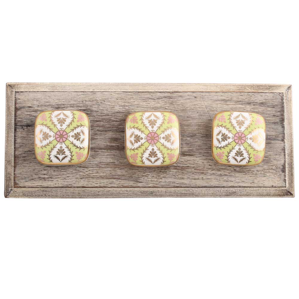 Golden Leaf Flower Square Ceramic Wooden Hook. A Perfect Complement to the Soft Tone of the Wood are these White Traditional Hat & Coat Hook Made of Genuine Porcelain and Brass. It can be use to Hang Jewellery, Leashes, Towels, Scarves, Light Weight Sweaters, Caps Etc.