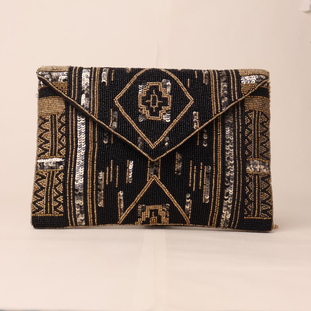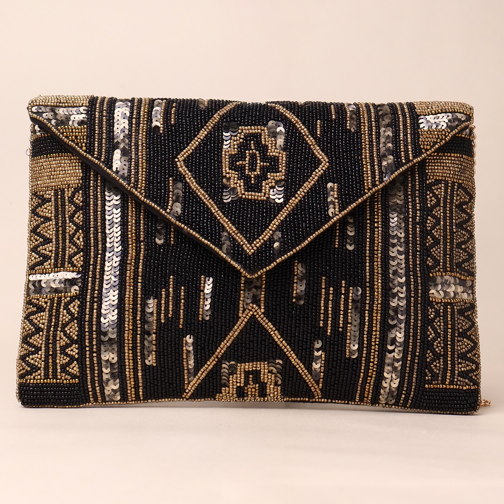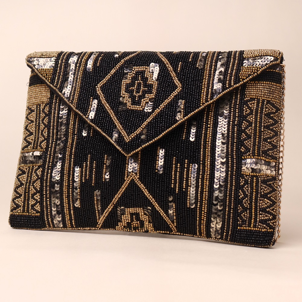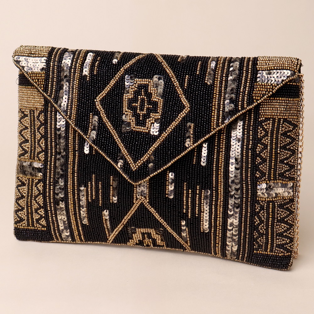 Radiate regal charm with this opulent hand-beaded clutch, adorned with traditional motifs and shimmering sequin highlights. The intricate craftsmanship and structured envelope silhouette make it a refined choice for evening affairs, weddings, and festive celebrations. Equipped with a detachable chain strap, this versatile clutch offers both handheld elegance and crossbody convenience.