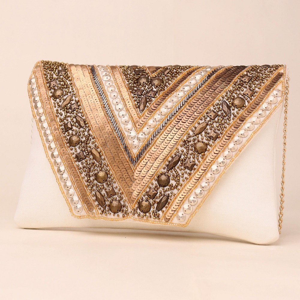 Step into a world of opulence with this exquisitely hand-embellished clutch, crafted to turn heads. The V-shaped front flap dazzles with metallic sequins, pearls, and shimmering beads in a luxe symmetrical pattern that evokes regal glamour. Finished with a refined white fabric base and a gold-toned detachable chain strap, this piece transitions seamlessly from handheld elegance to crossbody comfort—making it your ideal evening companion.