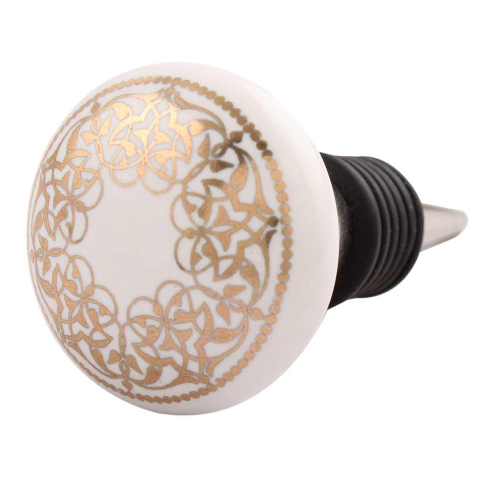 Golden Rangoli Pattern Flat Ceramic Wine Stopper.zinc alloy wine bottle stopper with attractive Jute Bag Packaging.