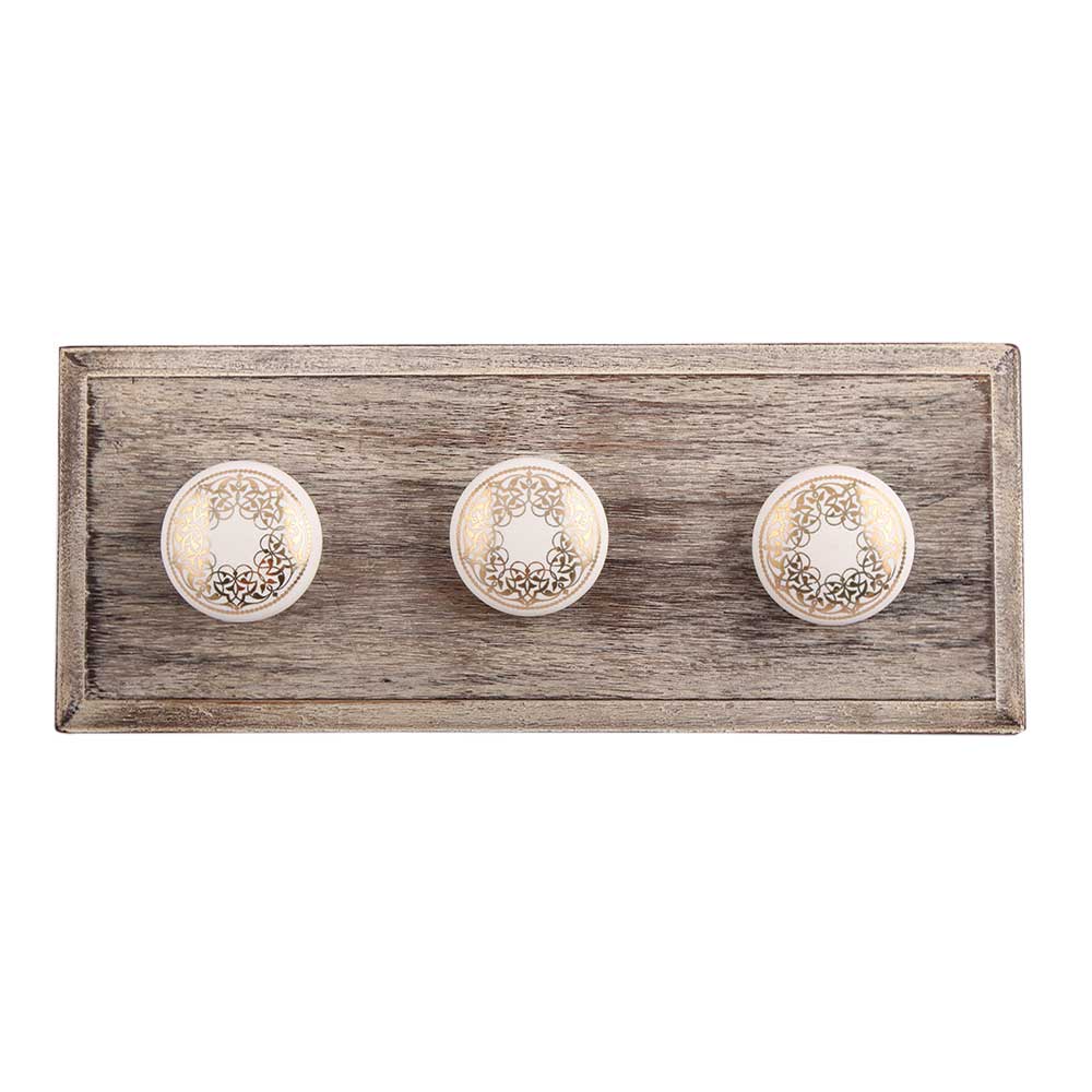 Golden Rangoli Pattern Flat Ceramic Wooden Hook. A Perfect Complement to the Soft Tone of the Wood are these White Traditional Hat Coat Hook Made of Genuine Porcelain and Brass. It can be use to Hang Jewellery, Leashes, Towels, Scarves, Light Weight Sweaters, Caps Etc.