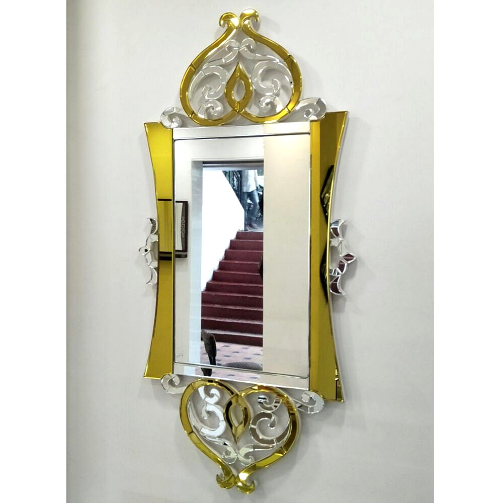 Introduce royal charm to your interiors with this golden crest scroll rectangular mirror, handcrafted from clear glass and finished with intricate crest and heart motifs. Its gold-accented frame and reflective clarity bring a regal aura to any space. Packed & quality-checked by Indianshelf.