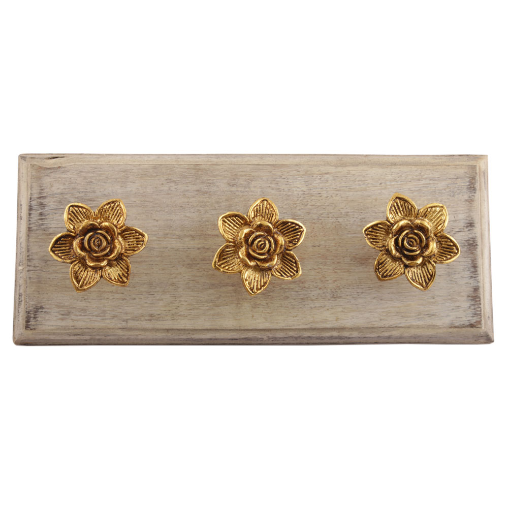 Golden Rose Flower Metal Wooden Hooks. A Perfect Complement to the Soft Tone of the Wood are these White Traditional Hat and Coat Hook Made of Genuine Porcelain and Brass. It can be used to Hang Jewelry, Leashes, Towels, Scarves, Light Weight Sweaters, Caps etc.