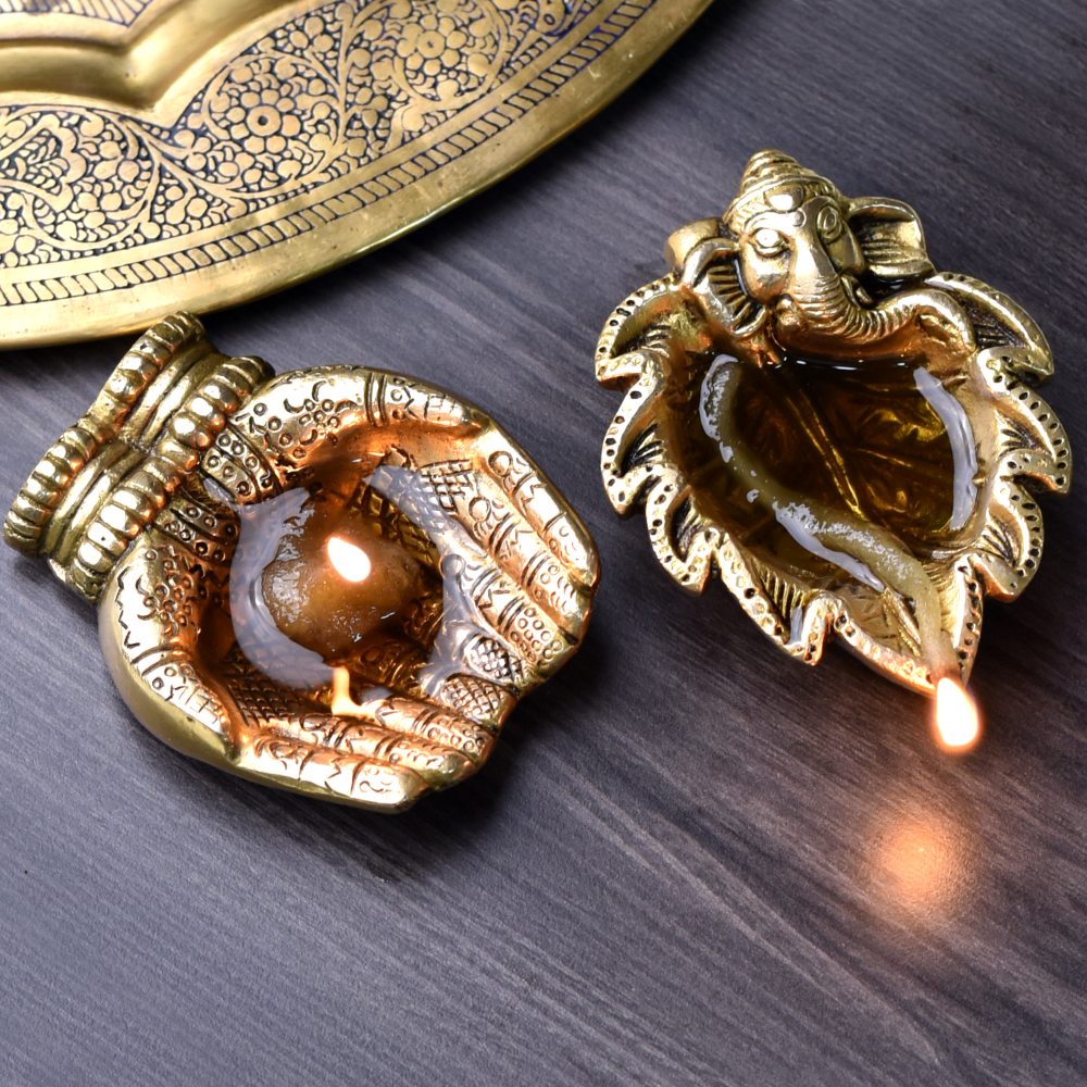 Celebrate the spirit of Diwali and everyday devotion with this Golden Shankh & Hands Brass Oil Lamp, designed as a symbol of blessings and purity. Featuring sacred motifs of the conch (Shankh) and divine hands, this diya represents prosperity, offering, and spiritual awakening. Cast in solid brass with a polished golden finish, it is perfect for mandir décor, Diwali lighting, and meaningful festive gifts.