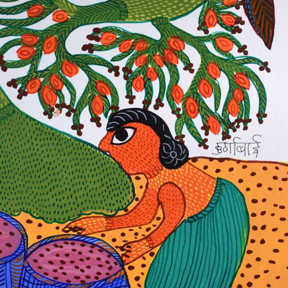 - Acrylic on paper: Durgabai’s use of acrylics creates a vivid, striking visual effect that enhances the bold colors and patterns.