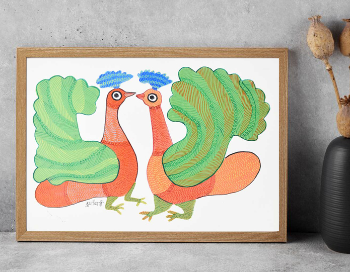 - Rich in geometric patterns and vivid colors, typical of Gond Art.