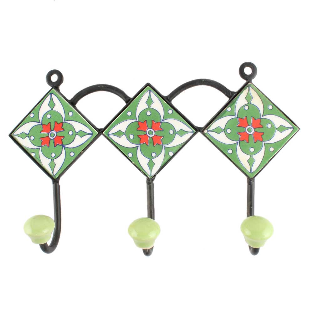 Green Ceramic Floral Tile Hook Online. When Put on Wall or Cabinet It is An Art in Itself. The Metal Part of this Hook is Black Powder Coated.