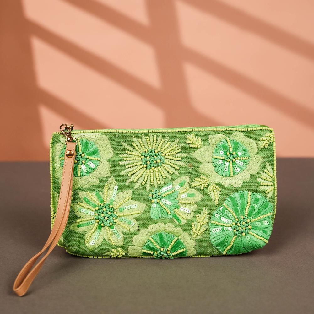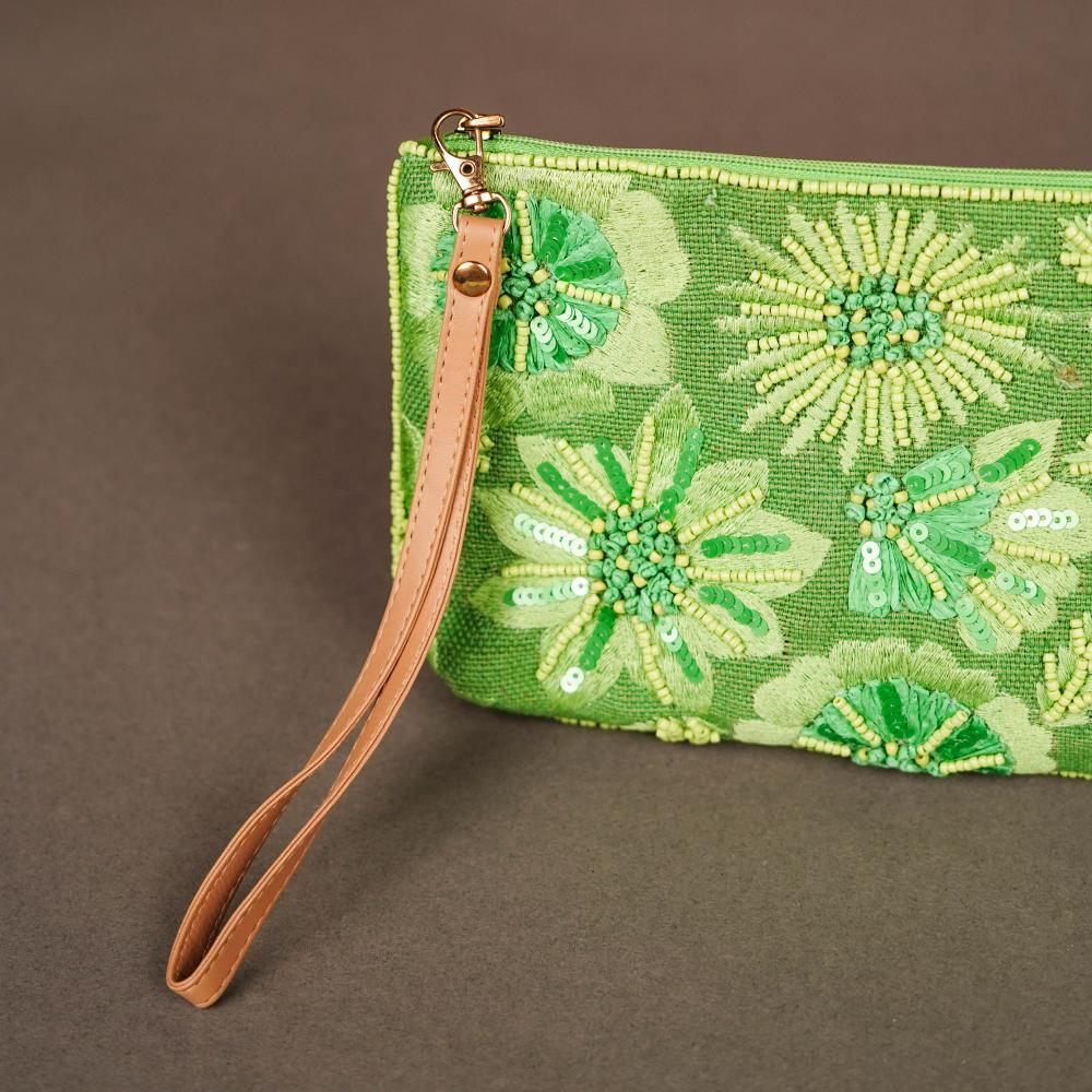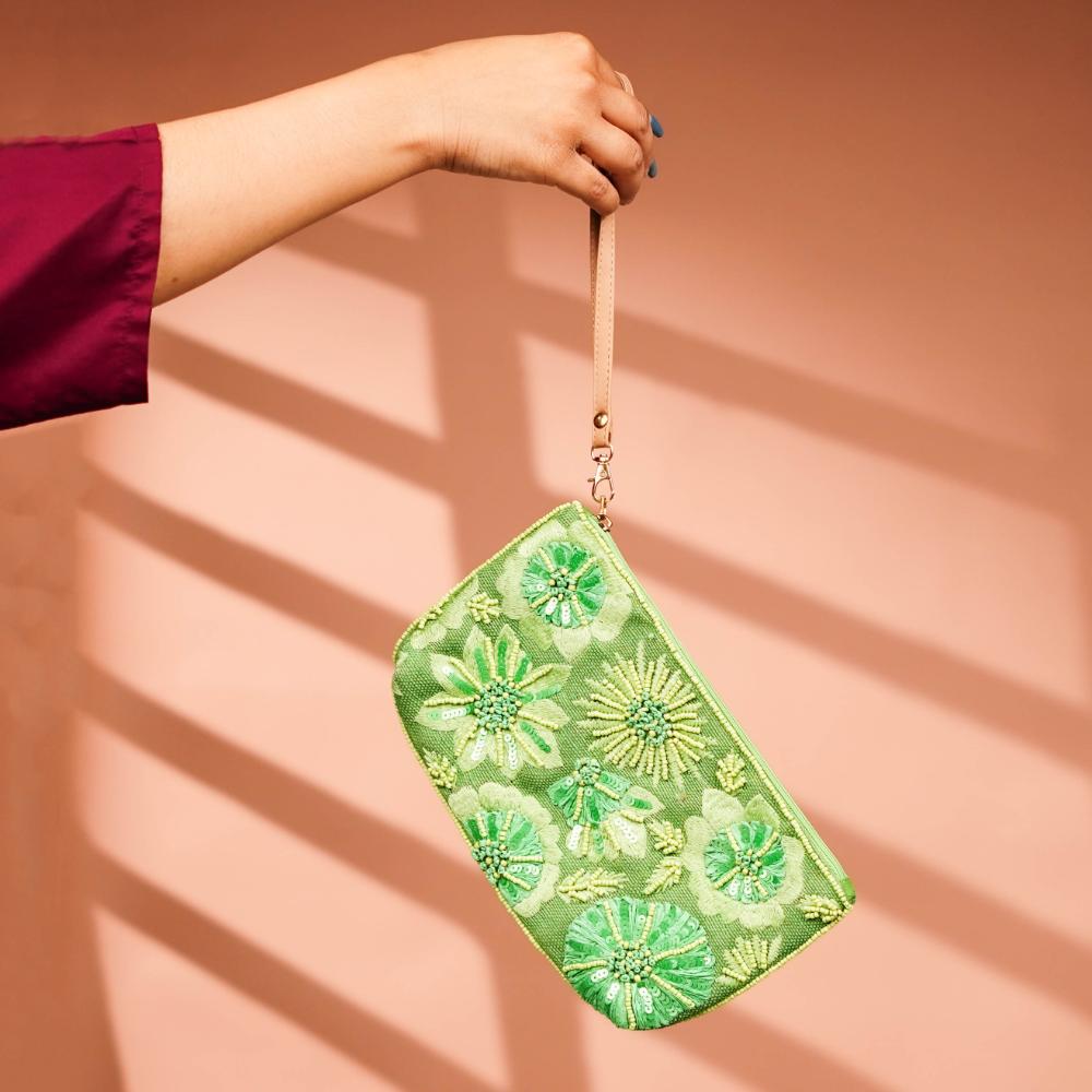 This cotton and beads handbag captures the refreshing spirit of nature with its floral beadwork in bright greens and soft detailing. The flowers bloom vibrantly across the green cotton base, radiating freshness and joy. Finished with a tan wristlet strap, this bag is easy to carry and pairs effortlessly with both casual and dressy looks. A perfect companion for day trips, holidays, or simply uplifting your everyday outfit.