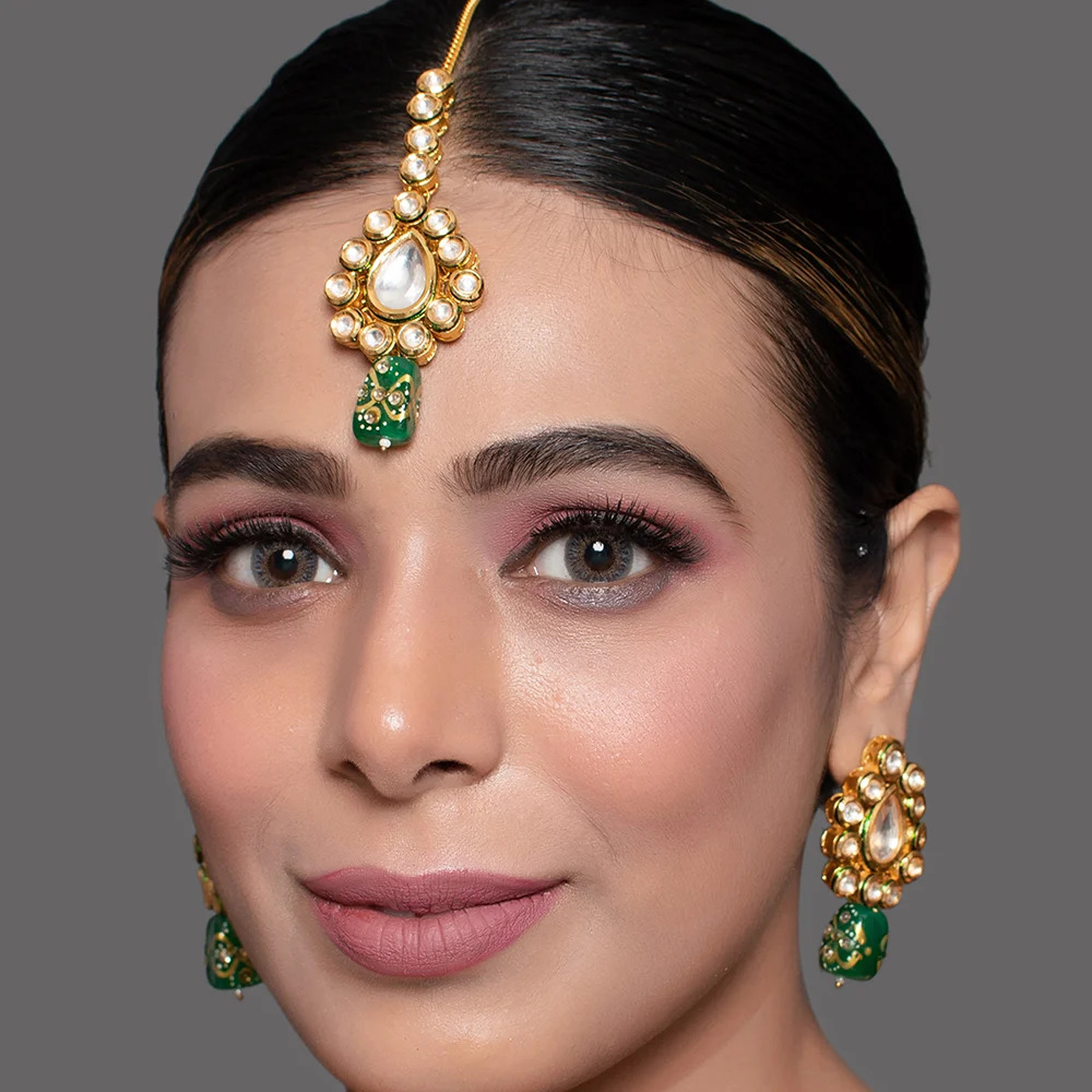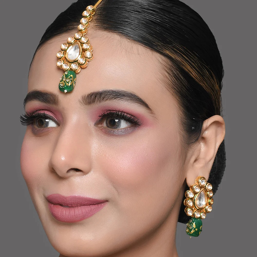 The Green Enamel Mirror Stone Choker Necklace Set with Earrings and Maang Tikka blends royal color with traditional craftsmanship. Designed in polished golden brass, the choker features white mirror stones framed by rich green enamel detailing that enhances its regal appeal. The coordinated earrings and maang tikka create a complete ceremonial look, perfect for weddings and cultural celebrations. Compact in structure yet bold in presence, this handcrafted set brings refined heritage styling to modern festive wear.