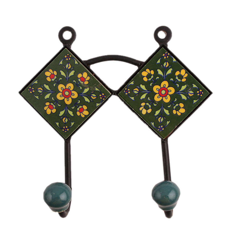 Green Floral Ceramic Tiles Hooks. When put on wall or cabinet it is an art in itself. The metal part of this hook is black powder coated.