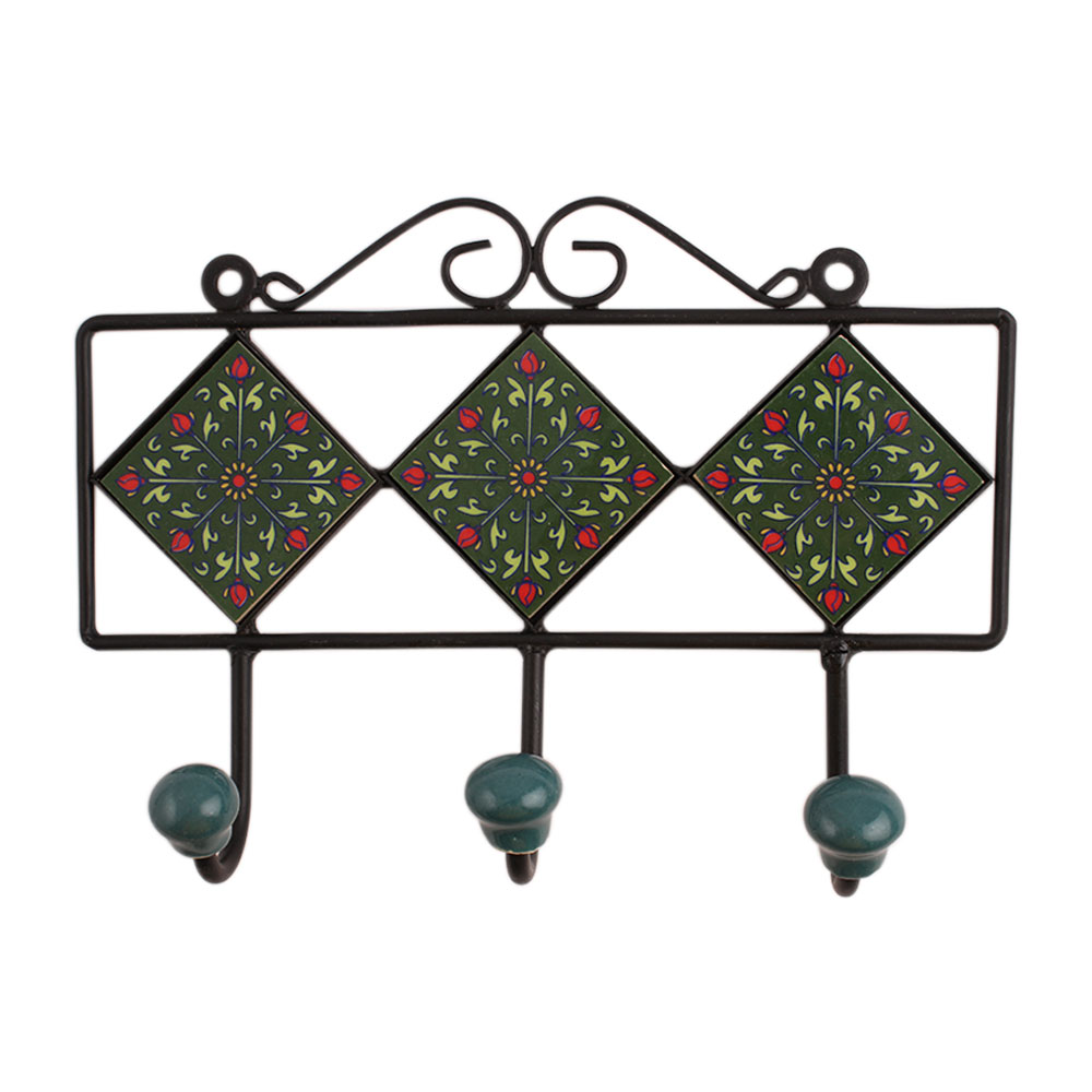 Green Floral Ceramic Tiles Hooks. When put on wall or cabinet it is an art in itself. The metal part of this hook is black powder coated.