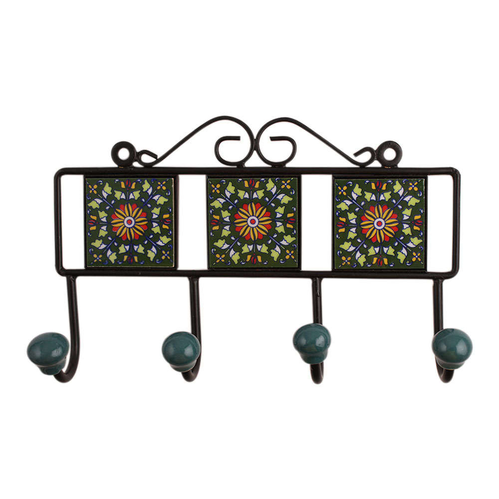 Green Floral Ceramic Tiles Hooks. When put on wall or cabinet it is an art in itself. The metal part of this hook is black powder coated.