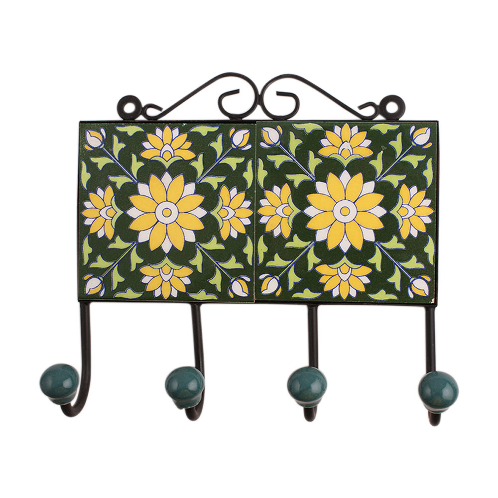 Green Floral Ceramic Tiles Hooks. When put on wall or cabinet it is an art in itself. The metal part of this hook is black powder coated.
