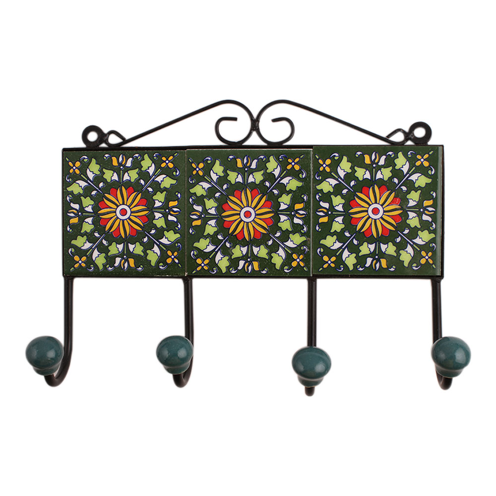 Green Floral Ceramic Tiles Hooks. When put on wall or cabinet it is an art in itself. The metal part of this hook is black powder coated.